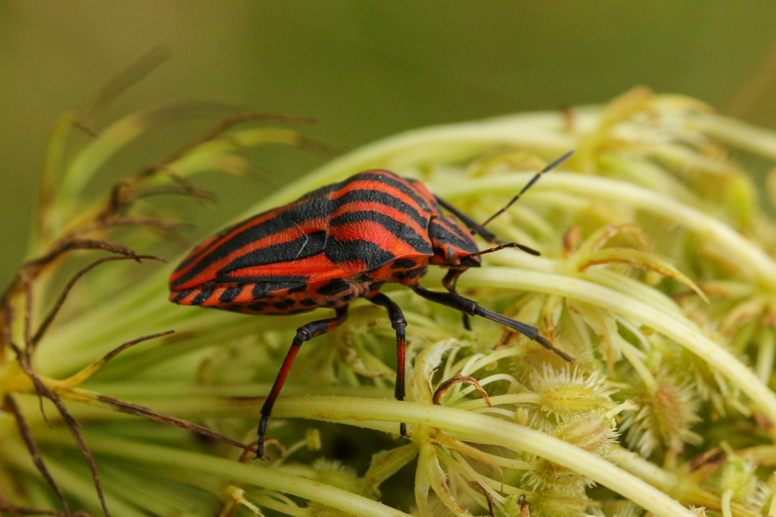 Er zaten twee pyjamaschildwantsen op de wilde peen. Af en toe kwam de zon tevoorschijn en dan klommen de wantsen snel bovenop de uitgebloeide peen om te zonnebaden. Dit is één van de wantsen, waarbij zowel de gestreepte rug als de buikzijde met stippen te zien is.