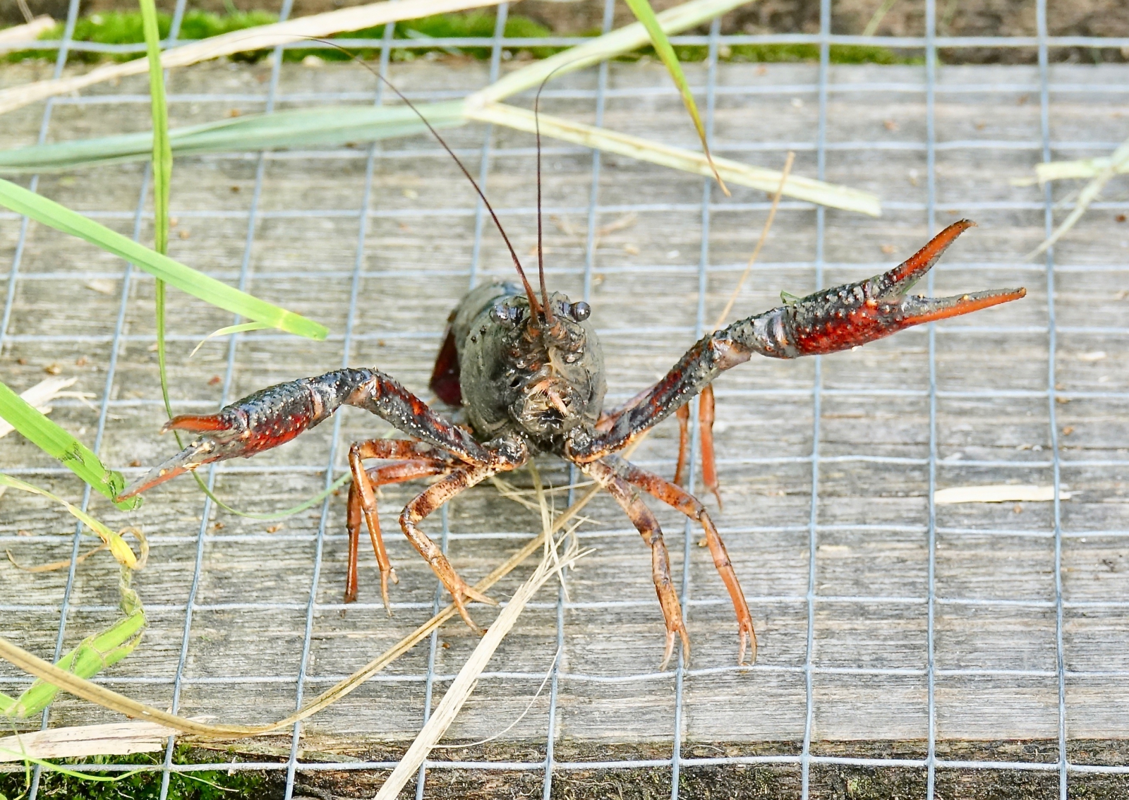 Op weg naar het kijkscherm in de Zouweboezem versperde deze Rivierkreeft de doorgang. Na een paar minuten nam deze de scharen en verdween in het water.