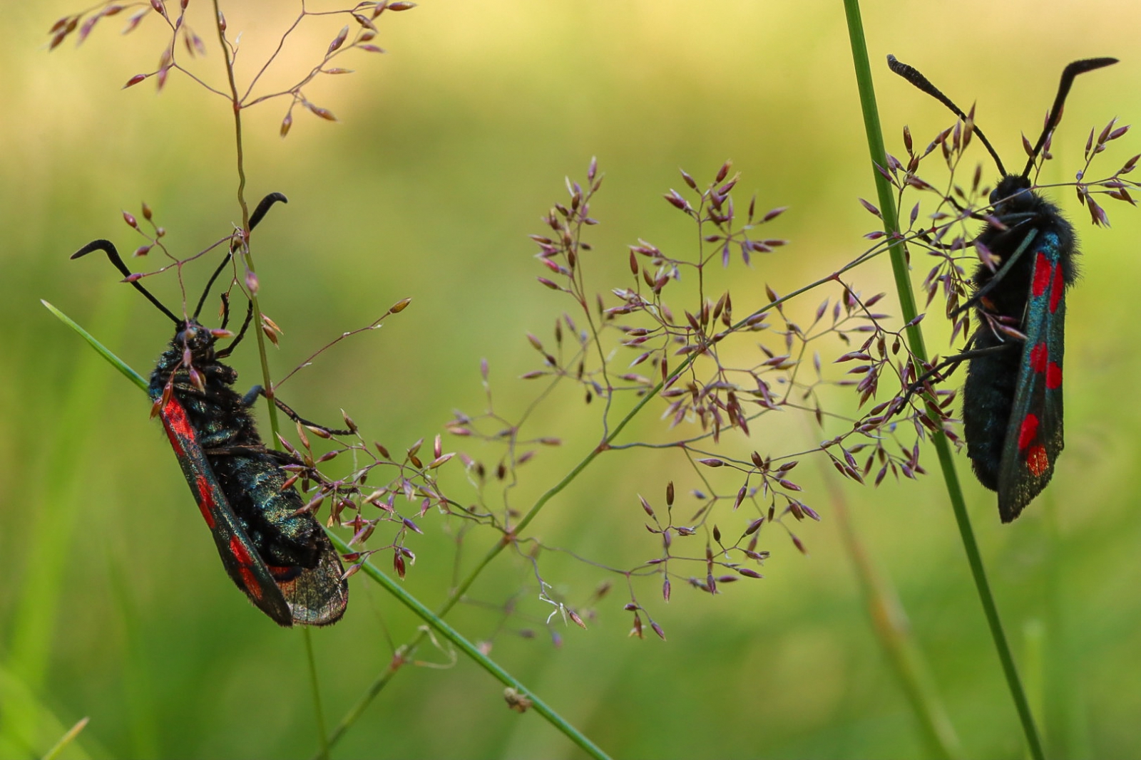 Twee Sint-jansvlinders bungelden aan een halm in het gras van Meijendel.