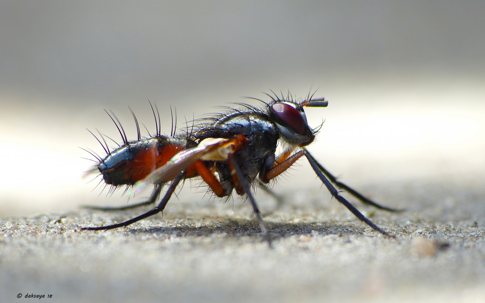Voor dit vliegje ging ik graag op m'n buik liggen. Op het eerste gezicht een gewoon vliegje, maar van dichtbij ziet hij er fraai uit. Hij valt op door de opstaande haartjes (bij de meeste sluipvliegen) en het oranjerood op de onderbuik en poten.