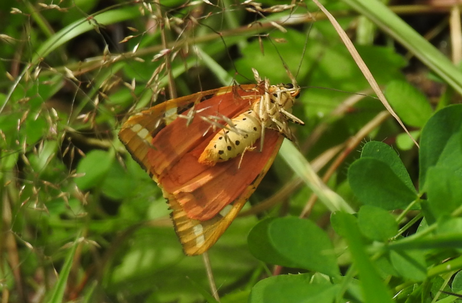 De Spaanse vlag is een dagactieve nachtvlinder uit de familie van de spinneruilen, onderfamilie beervlinders. Hier onderaanzicht. Een totaal andere kleur dan aan de bovenkant.