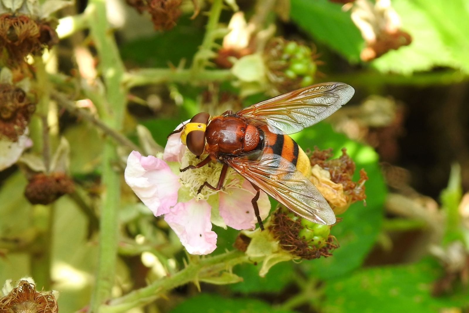 Dacht eerst een Hoornaar te zien, maar nee, de Stadsreus is een grote maar onschuldige zweefvlieg. Mimicry wordt het genoemd, wanneer een insect lijkt op een gevaarlijke soort. De belangrijkste verschillen hier echter, zijn de zeer slanke wespentaille, die zweefvliegen niet hebben, en de schichtige vliegbewegingen. Een echte Hoornaar vliegt zigzaggend en vloeiender. Ook zijn de ogen van een wesp meer langwerpig van vorm, en die van de zweefvlieg bijna rond.
