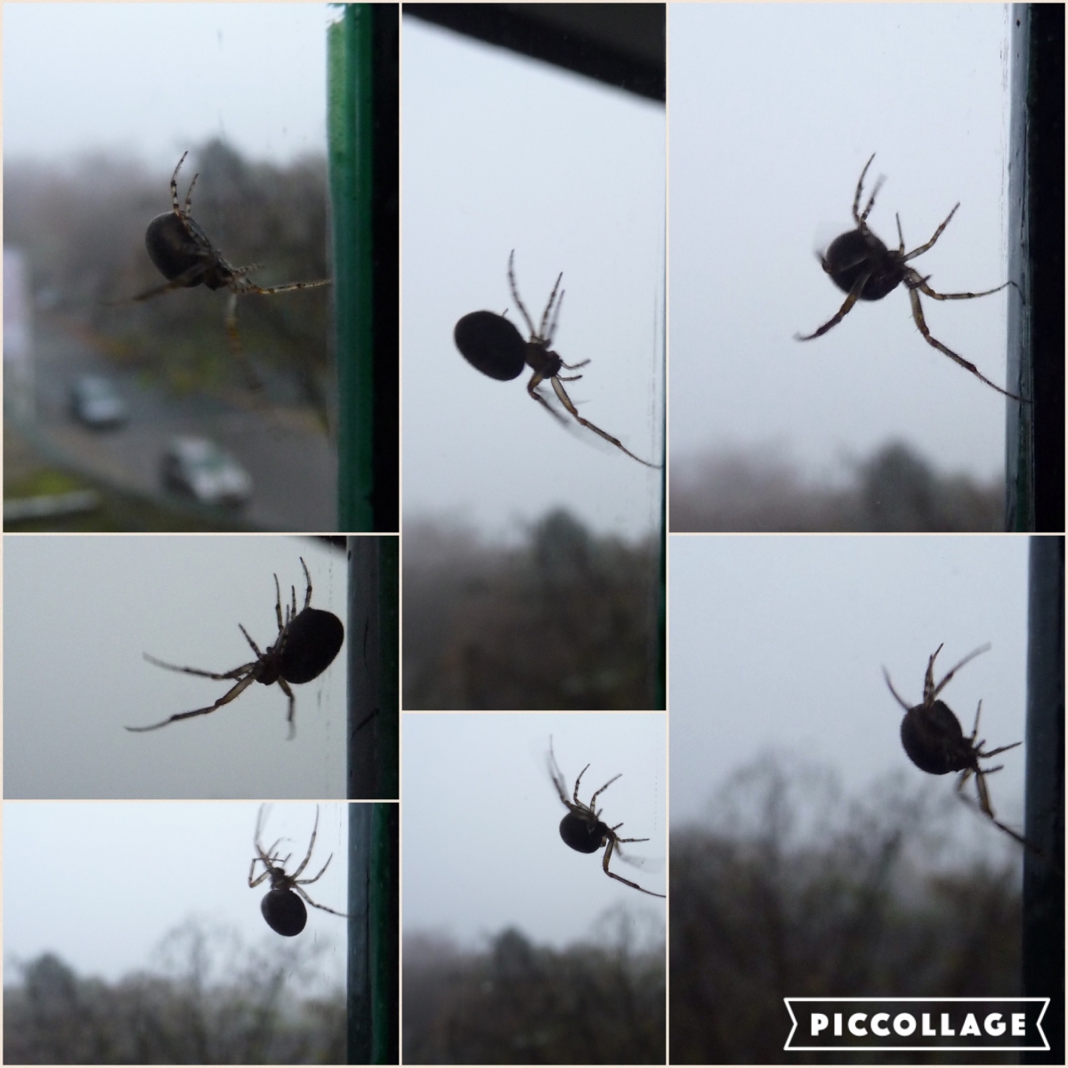 Vanmorgen om half negen hing er een spinnetje in de hoek van het raam van de balkondeur, ik heb deze foto's door het raam gemaakt, toen hij van boven naar beneden bewoog.