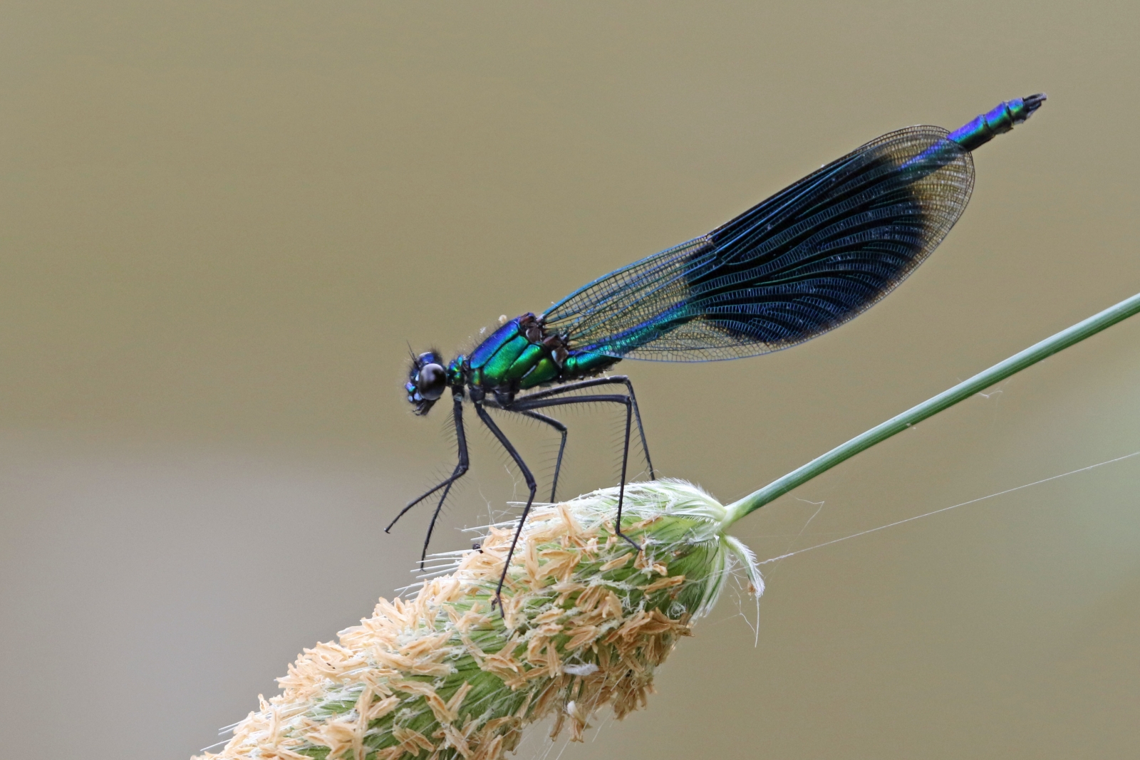 Dit mannetje is duidelijk herkenbaar aan de donkerblauwe vlek op zijn doorzichtige vleugels.