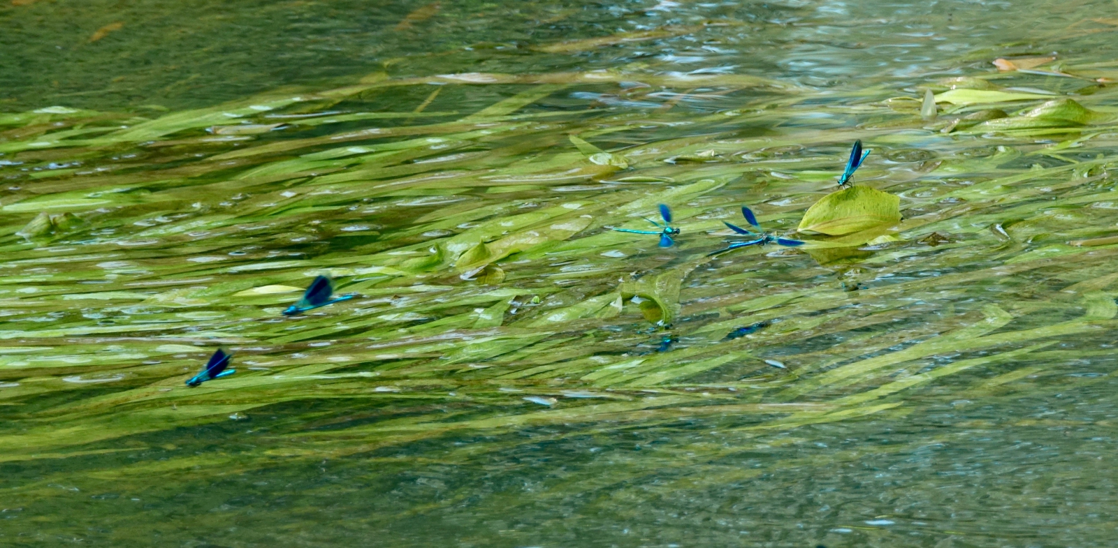 Juffers boven het met wieren gevulde stromende water van rivier De Dommel.