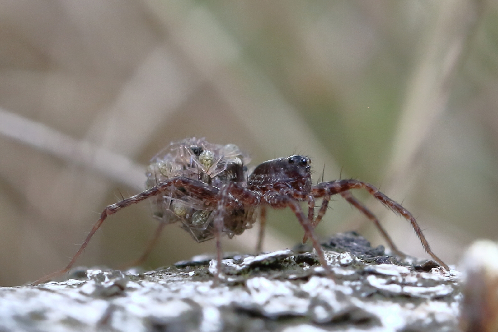 Heel mooi deze wolfspin met kroost, prachtig met die achtergrond.