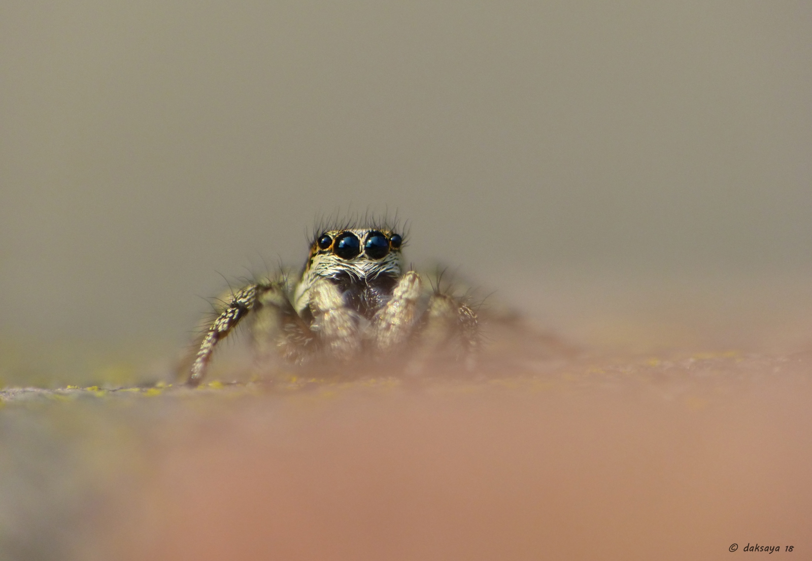 Het is echt een uitdaging om dit spinnetje recht in de camera te laten kijken met z'n glimmende zwarte kraaloogjes. Ze zitten vaak op vensterbanken en muren bij mooi weer om te jagen. Ze hebben vaak een prooi te pakken die vele malen groter zijn dan zij zelf.