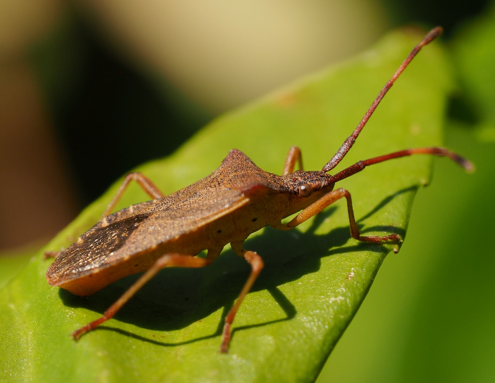 Deze bruine wants en vermoed een zuringwants geniet nog even van de avondzon op onze laurierhaag.