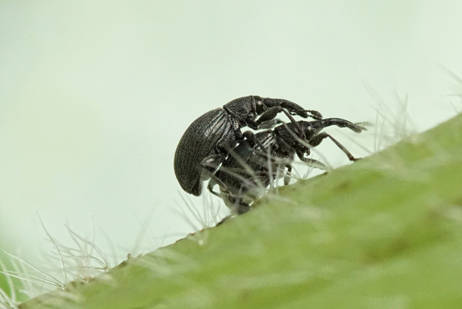 Zwarte snuitkevers op stokrood