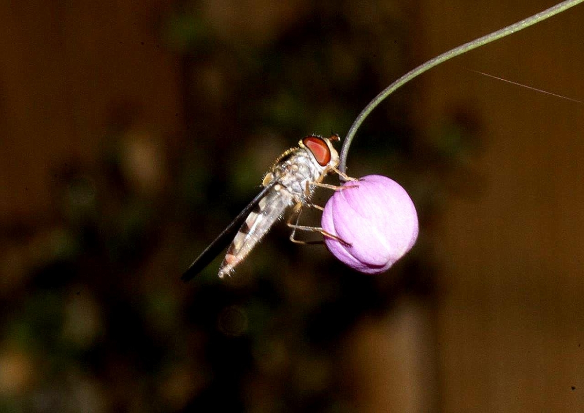 Op het kleinste bloempje in mijn tuin lijkt het zweefvliegje wel een groot monster.