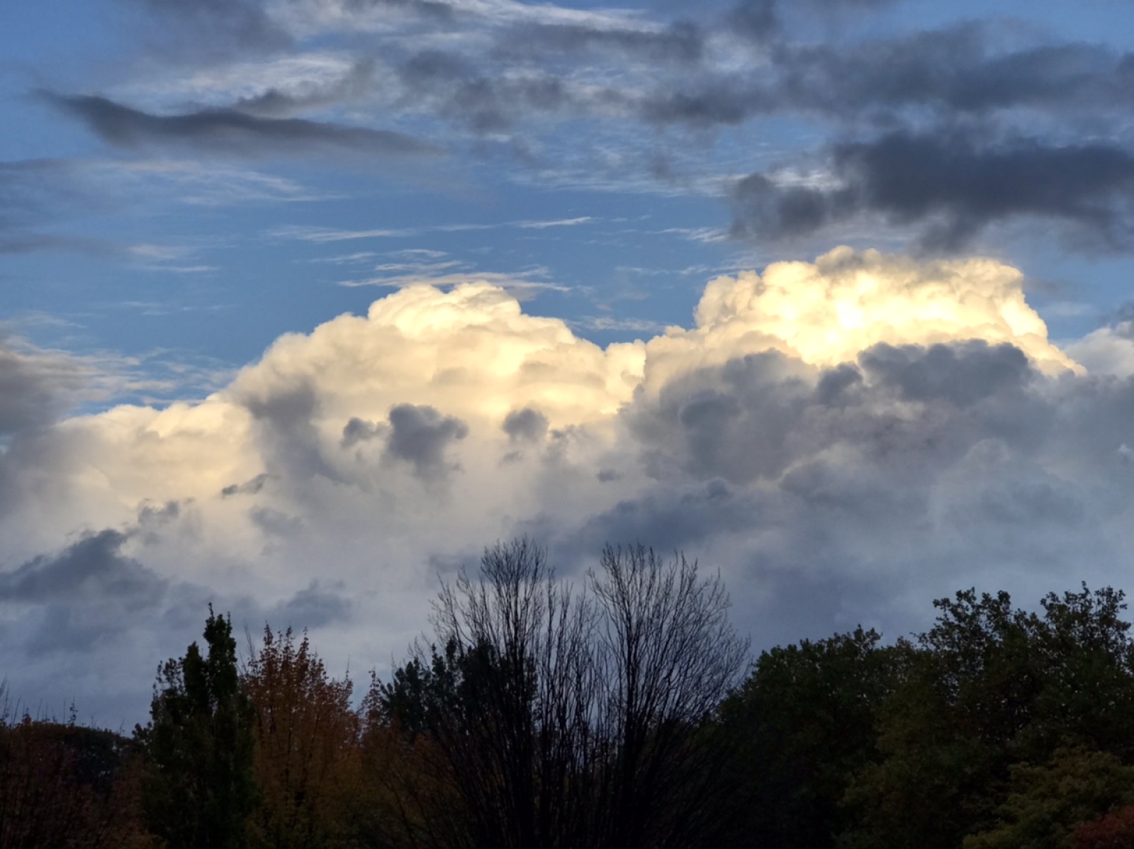 Mooie lucht, met het zonnetje nog op de bovenste rand van de wolkenpartij.
