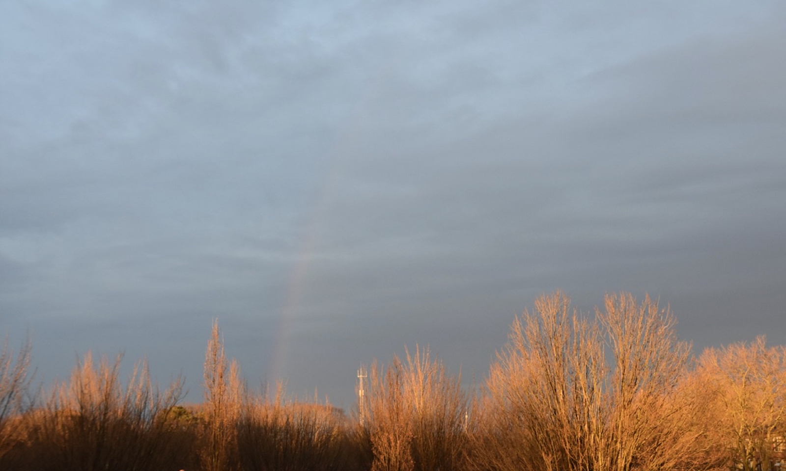 Een paar minuten, regenboog, goud licht op de bomen.