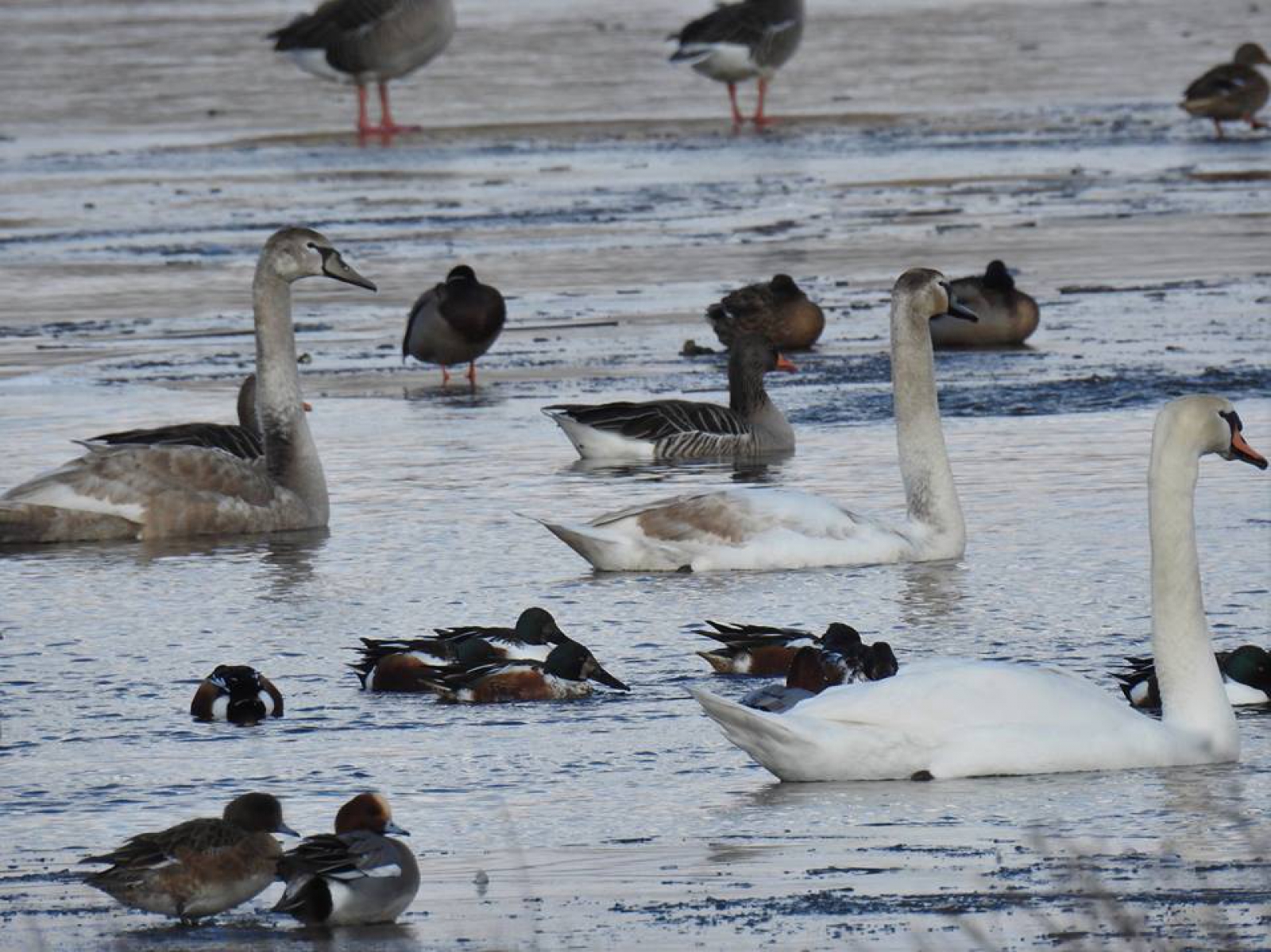 De waterplas is bijna dichtgevroren. De watervogels zoeken elkaar op. Knobbelzwanen, slobeenden, smienten en grauwe ganzen.