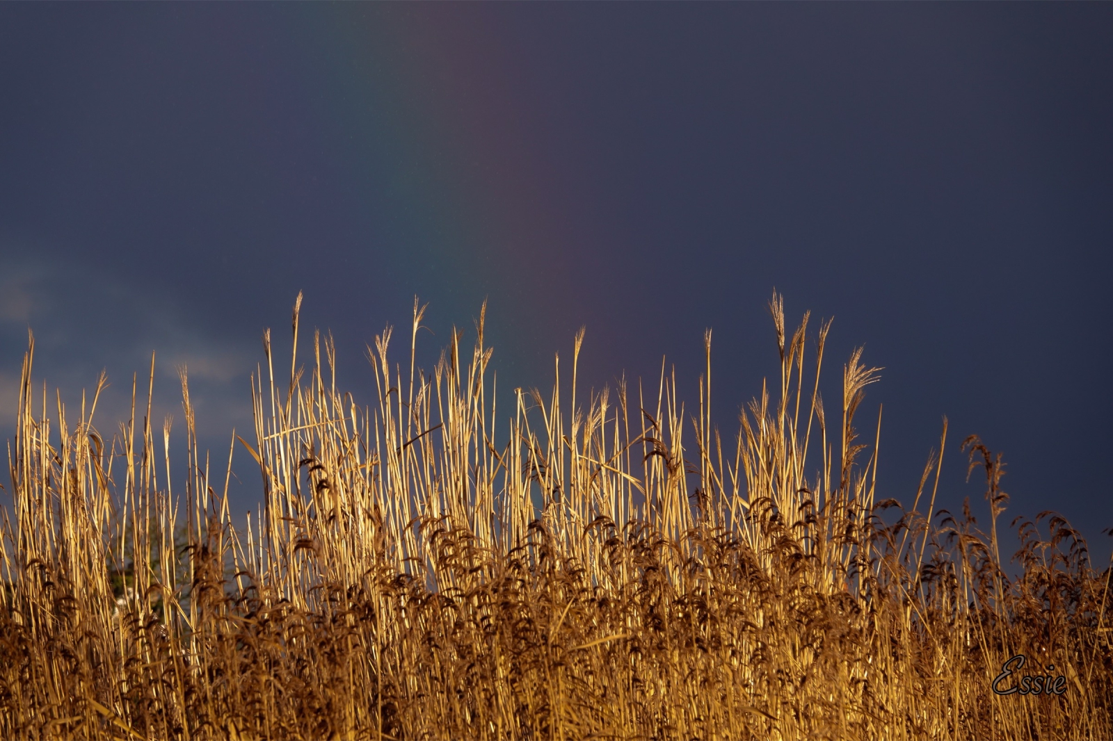 Begroeiing komt goed uit tegen de donkere lucht mét vage regenboog. Mooi.