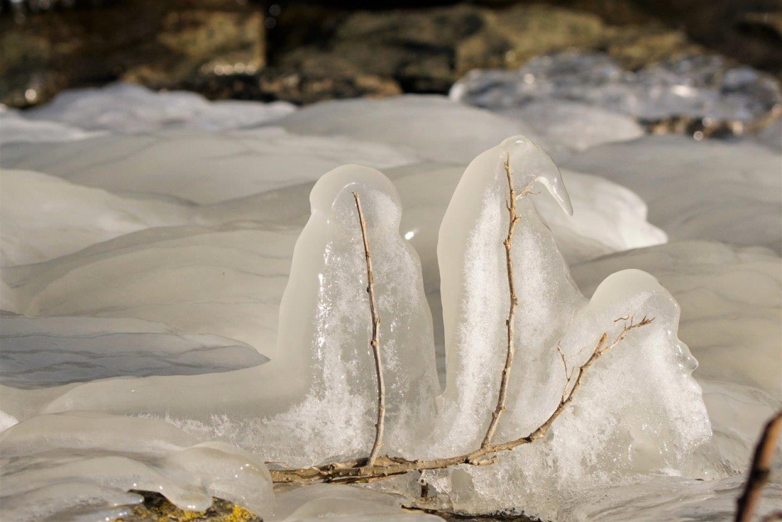 de harde wind en de vorst zorgen voor mooie kunst werkjes langs de waterkant.
