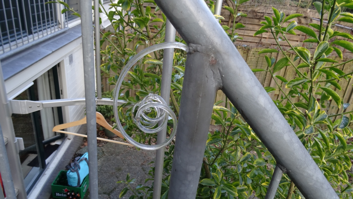 aan een zinken trapleuning zijn een paar bijzondere "ijspegels"ontstaan.