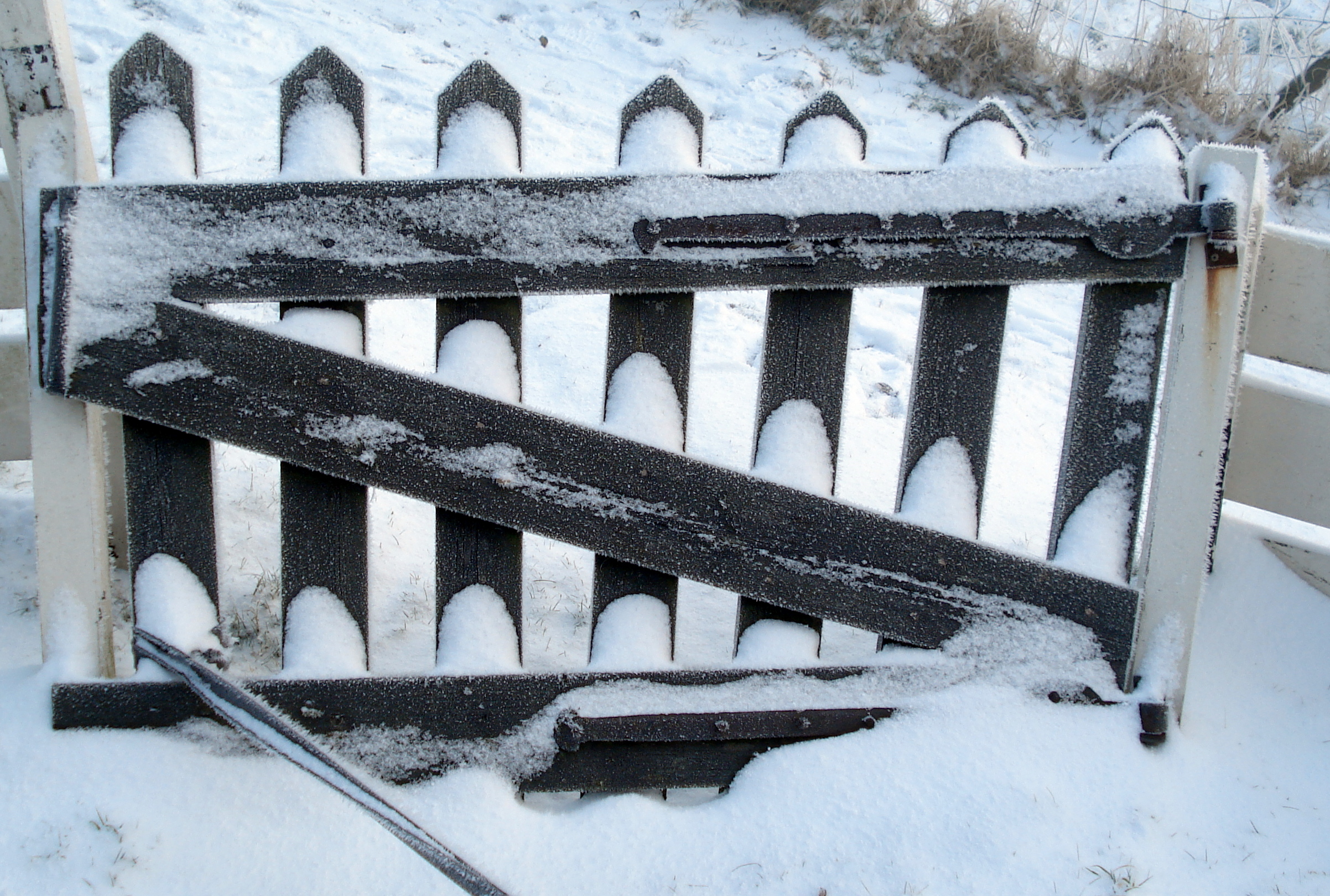 Zwart klaphekje en de sneeuw! Hoe kan de sneeuw op de staanders, zo apart van vorm, erop gaan zitten, voor het gezicht 'lijken het open rondingen? Vroeger veelal 'klaphekjes op een molenerf stonden!
