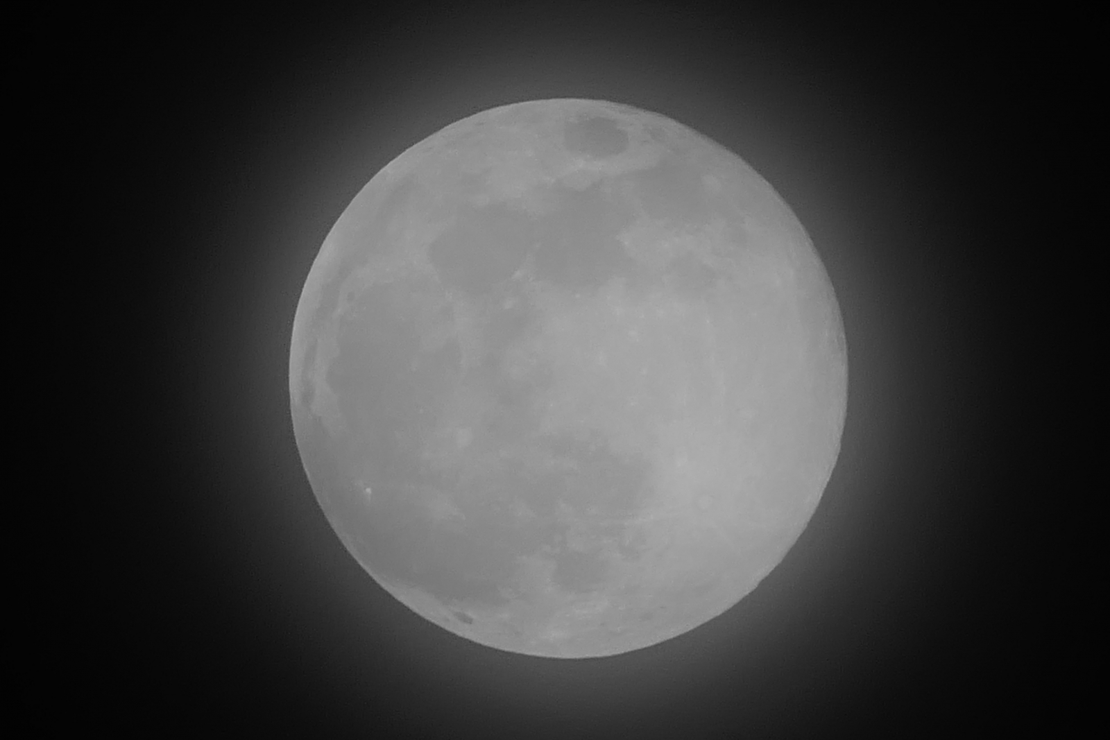 De supersneeuwmaan met een halo en wat sluierbewolking. Grootste en felste volle maan van 2019. 21.00 uur