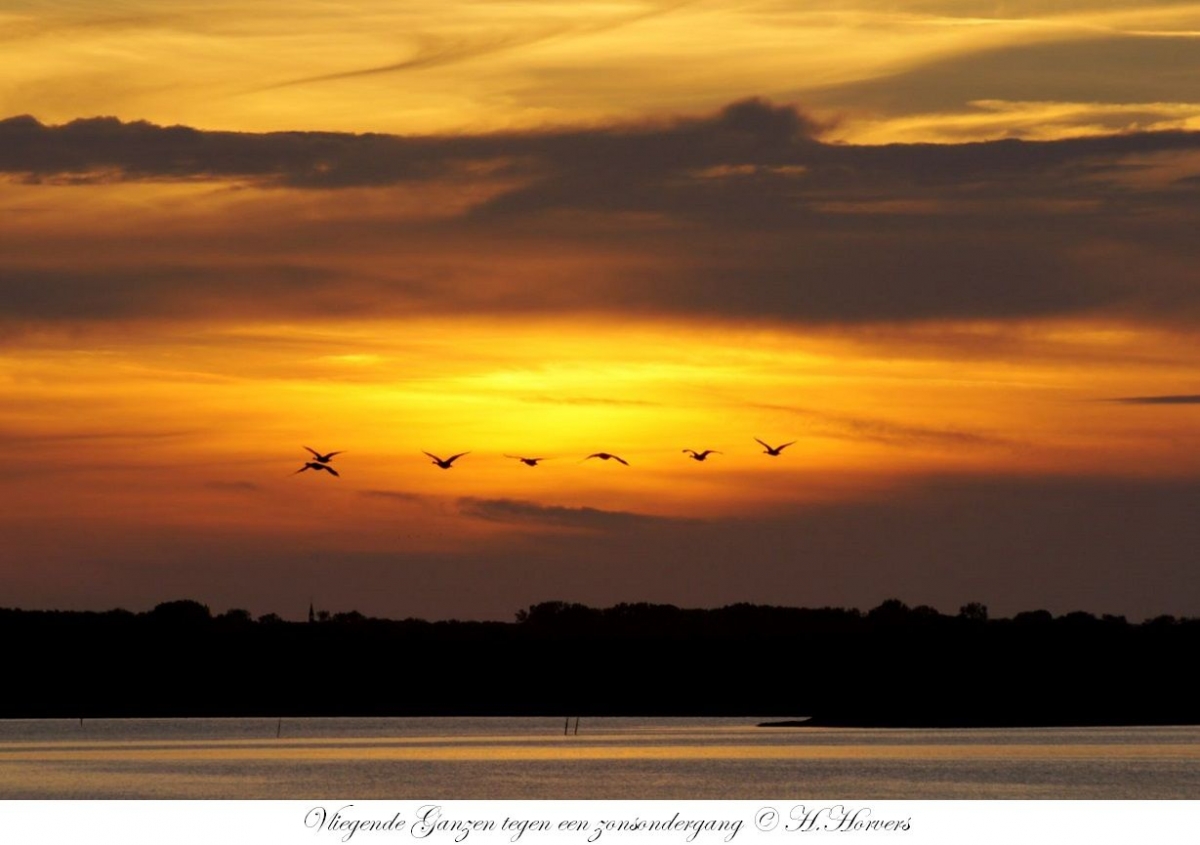 Vliegende Ganzen tegen een zonsondergang