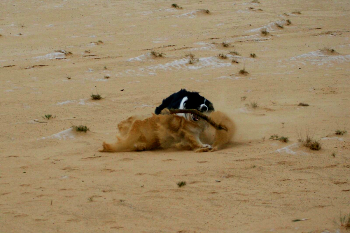 Onze Border Collie vangt zijn stokken graag met spectaculaire slidings. Maar na het schieten van deze foto moesten we even twee keer kijken: gaat hij nou achter een stok aan of heeft 'ie een leeuwin te pakken?