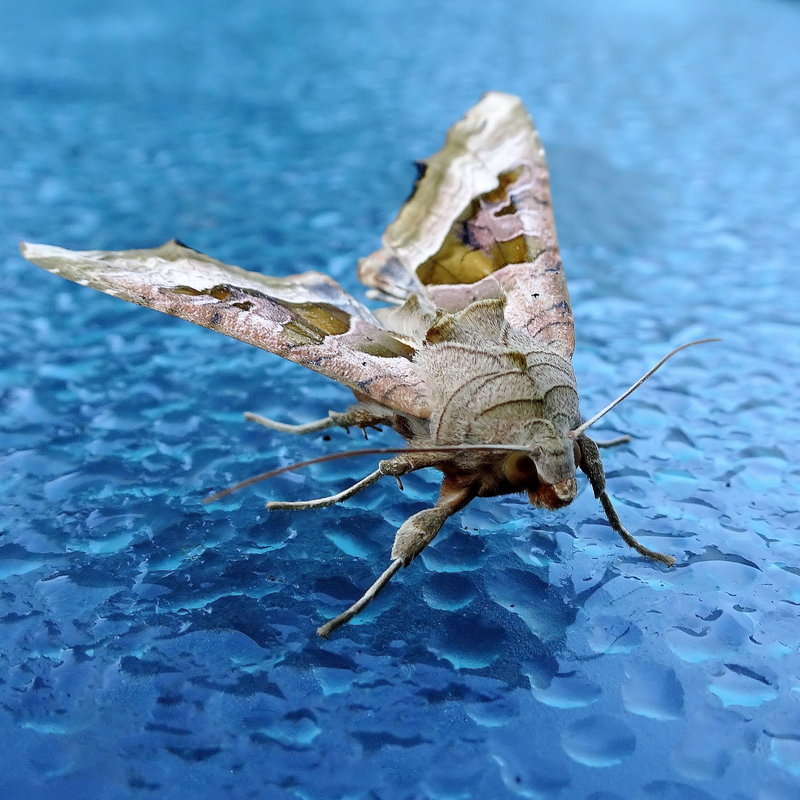 Zondagochtend 3 september 9.00 uur: een agaatvlinder koestert zich in een voorzichtig zonnetje op de glasplaat van onze tuintafel. Haar (of is het: zijn?) pootjes in de ochtendlijke dauwdruppels. TL