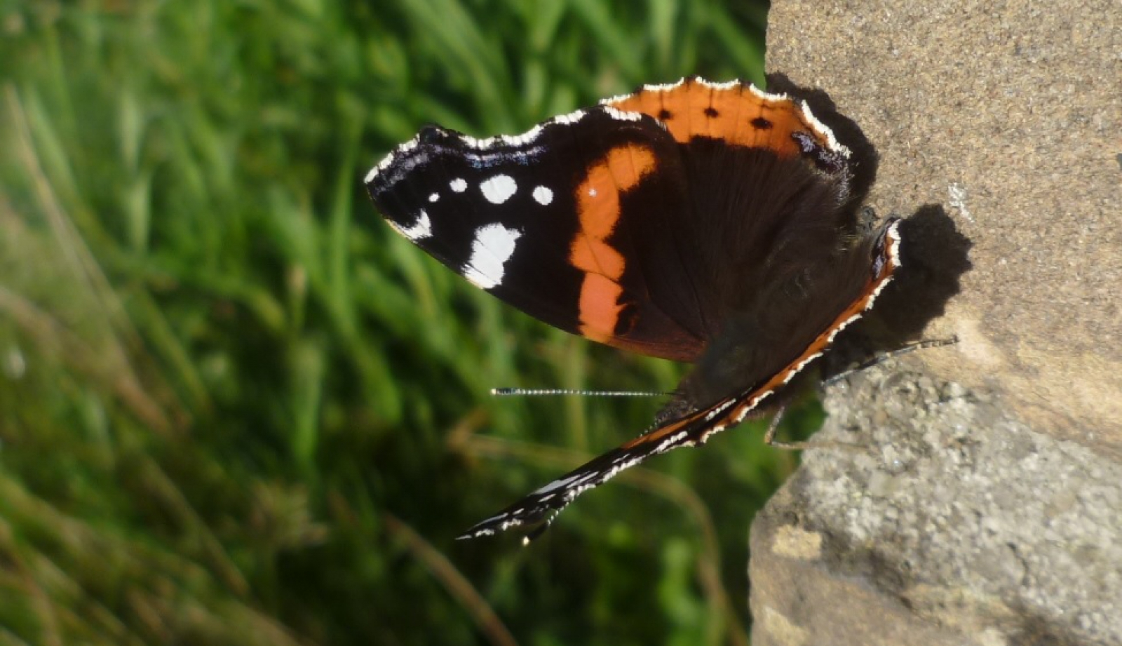 28 augustus 2017. Ik fotografeer de atalanta zonnebadend op witte muur, vleugels omhoog. Als ik schaduw op hem laat vallen opent hij zijn vleugels even zodat ik deze foto kan nemen. Probeer het verschillende keren met zelfde reactie.