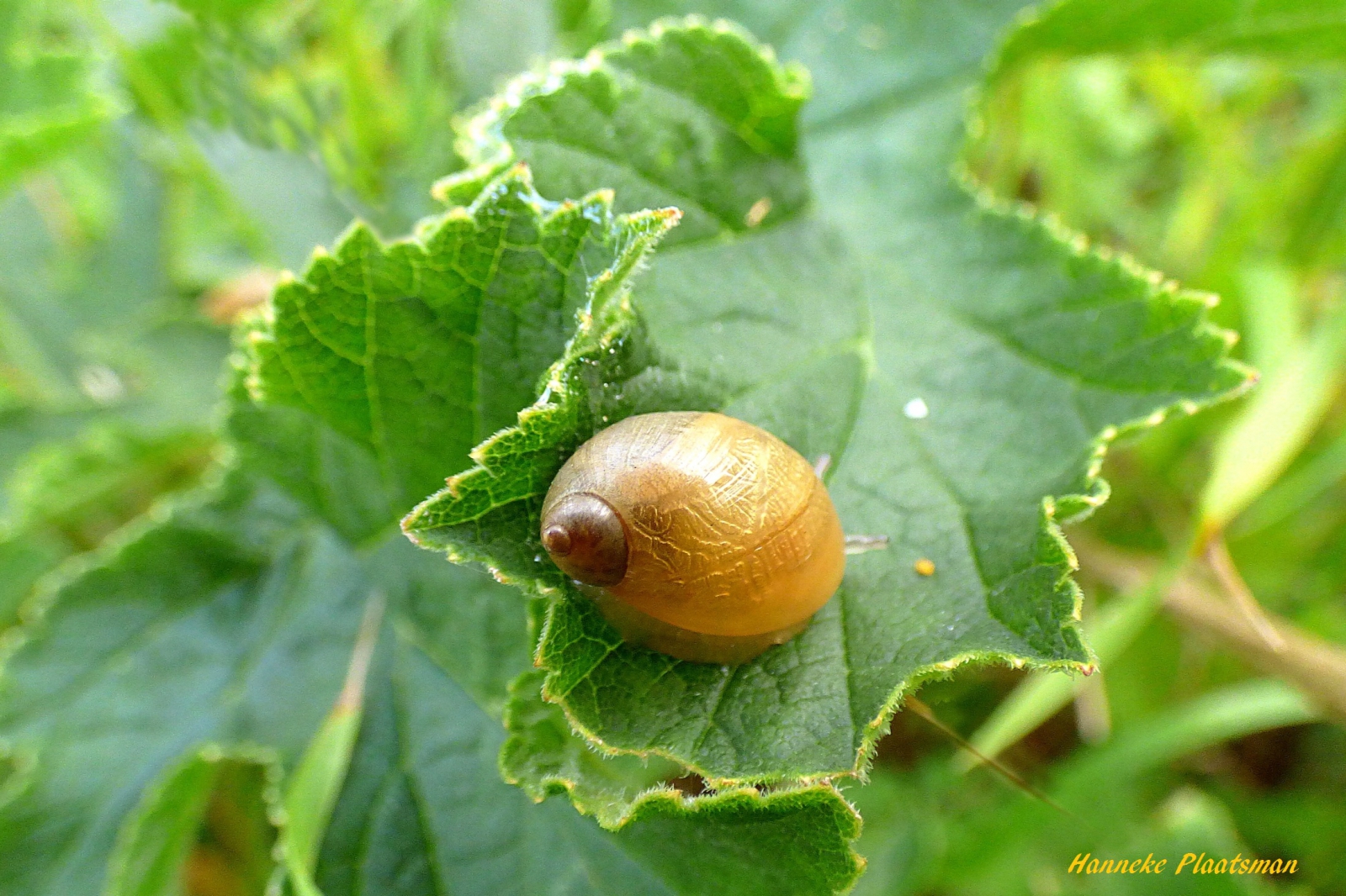 Barnsteenslakje. zijn huisje is bijna doorzichtig.