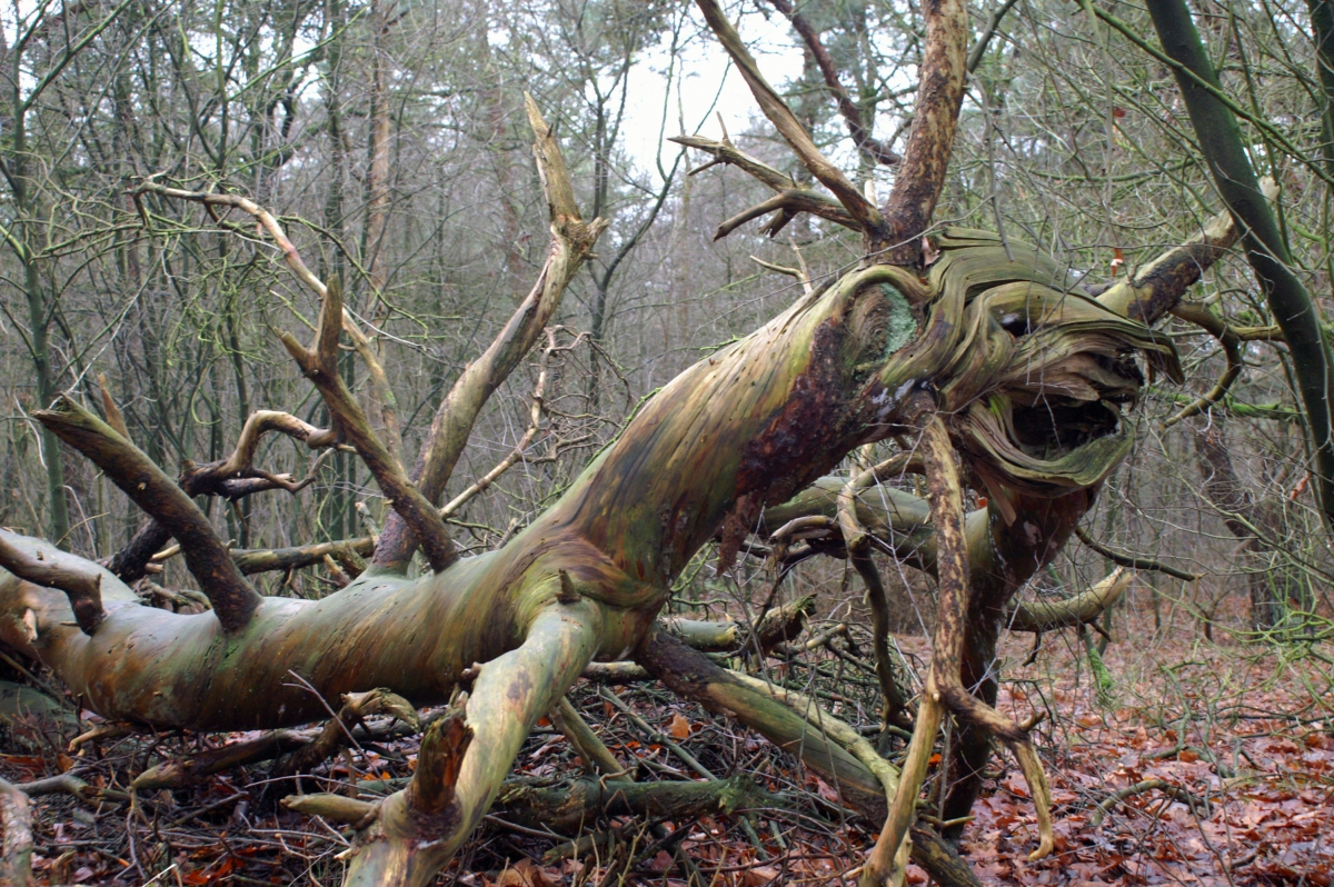 we liepen door het bos en op afstand leek deze omgevallen boom net een draak met de kop, oog, poten