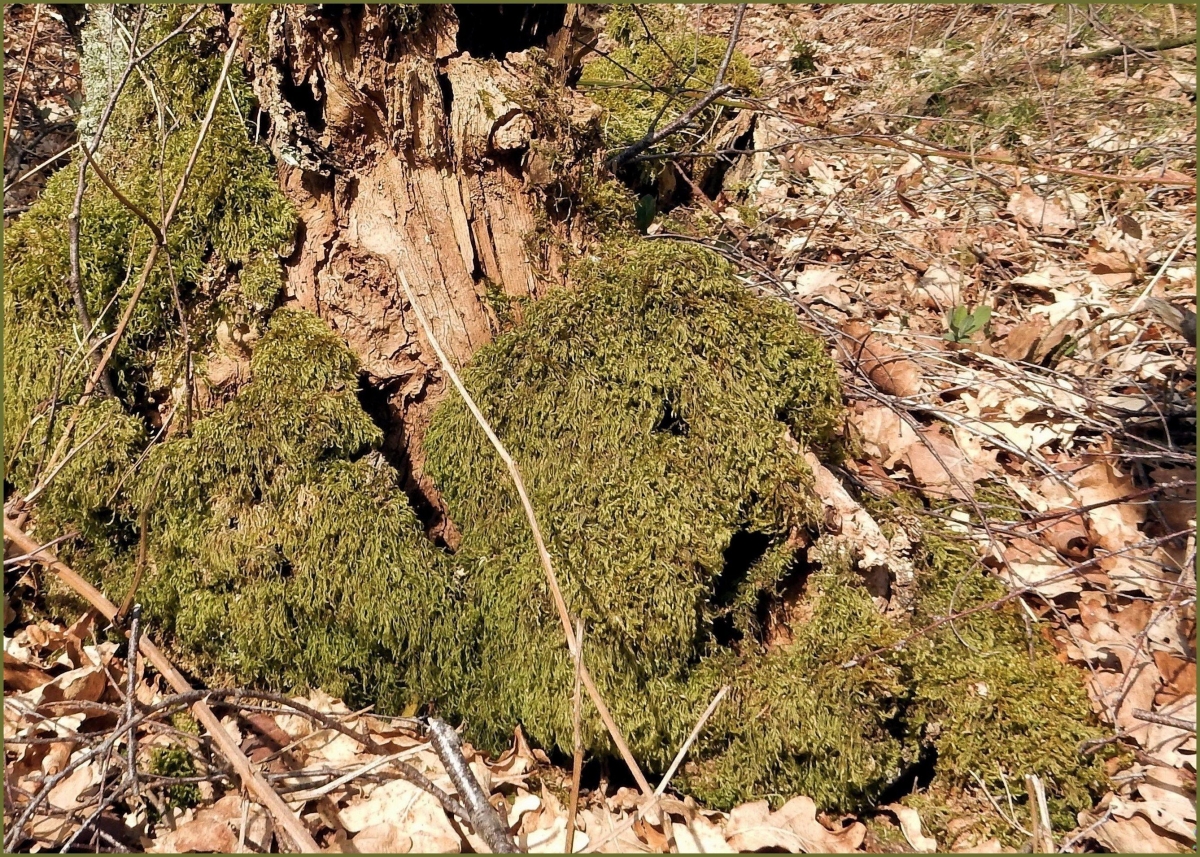 Tijdens een boswandeling viel mijn oog op een mooie begroeide boomstronk. Bij het erom heen lopen ontdekte ik dat er net een luie hond lag, gapend en genietend van het zonnetje.