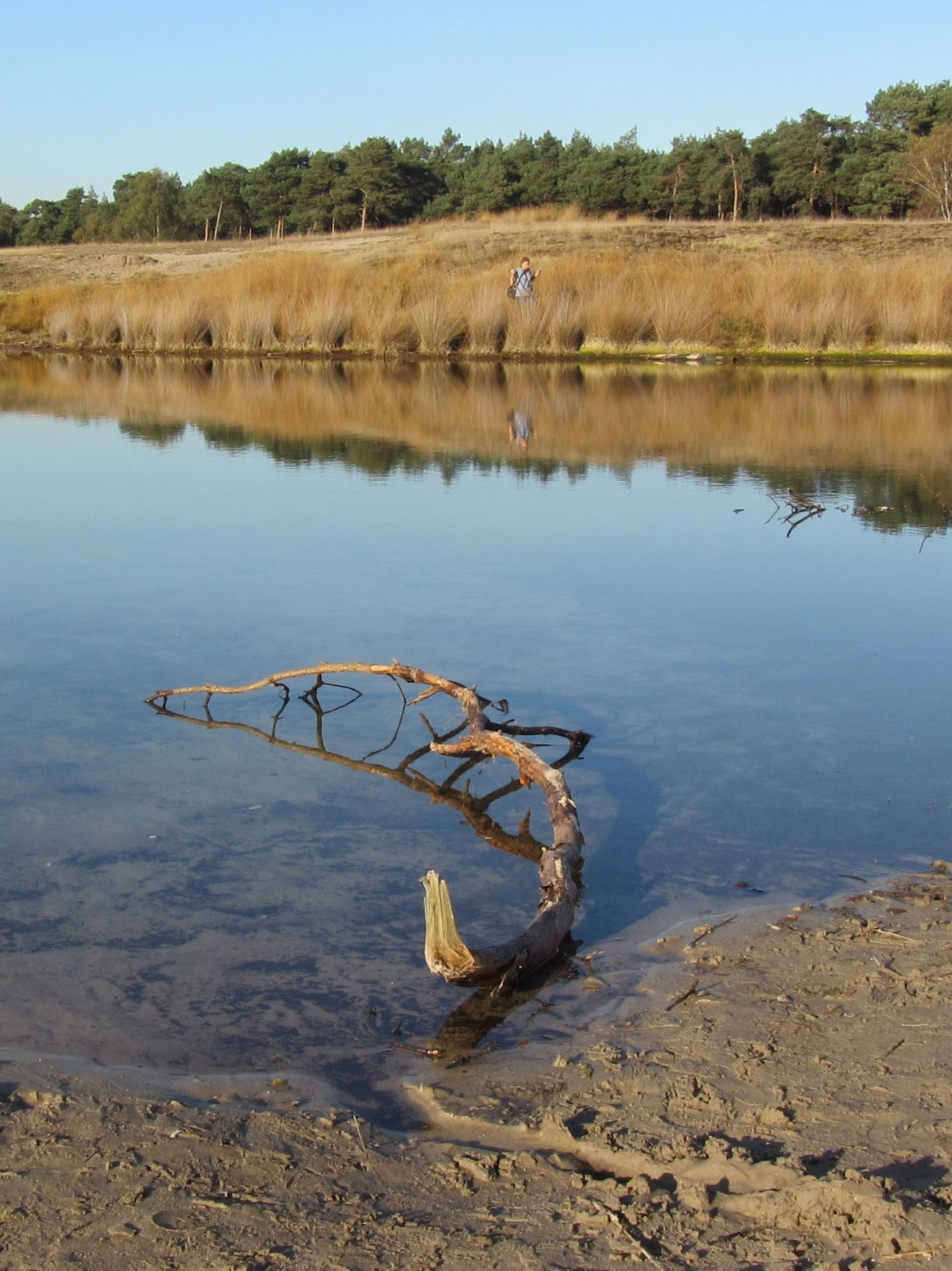 Door de spiegeling in het water lijkt deze tak op een reptiel dat uit het zand in het water kruipt. Typisch gezichtsbedrog.
