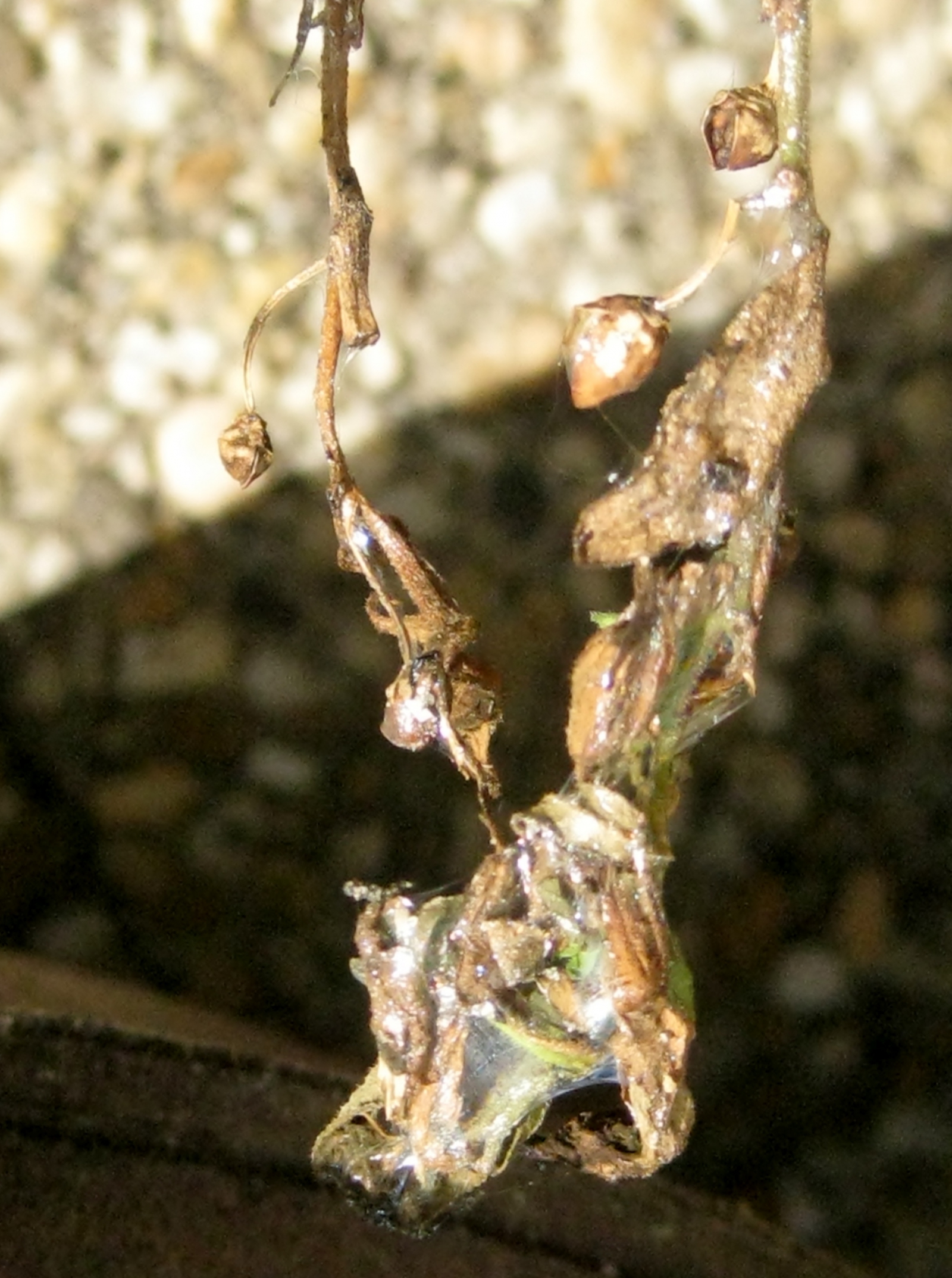 Slijmspoor van een slak op een verdroogd steeltje van een petunia.
