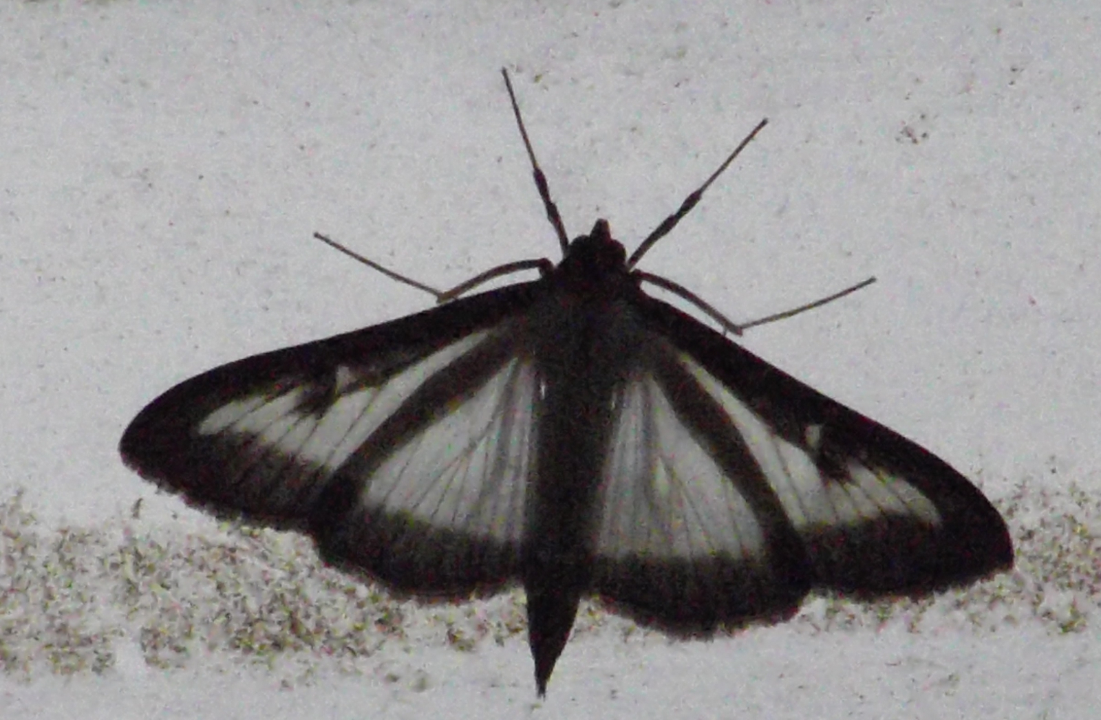 Deze foto is met tegenlicht genomen van een vlinder die tegen een transparant golfdakje schuilde voor de zware regenval op woensdagavond 30 augustus in Tilburg. Welke vlinder is dit ? Kon hem niet vinden bij de vlinderstichting onder de bijna 1000 afbeeldingen. Zonder tegenlicht ziet hij er wellicht anders uit.