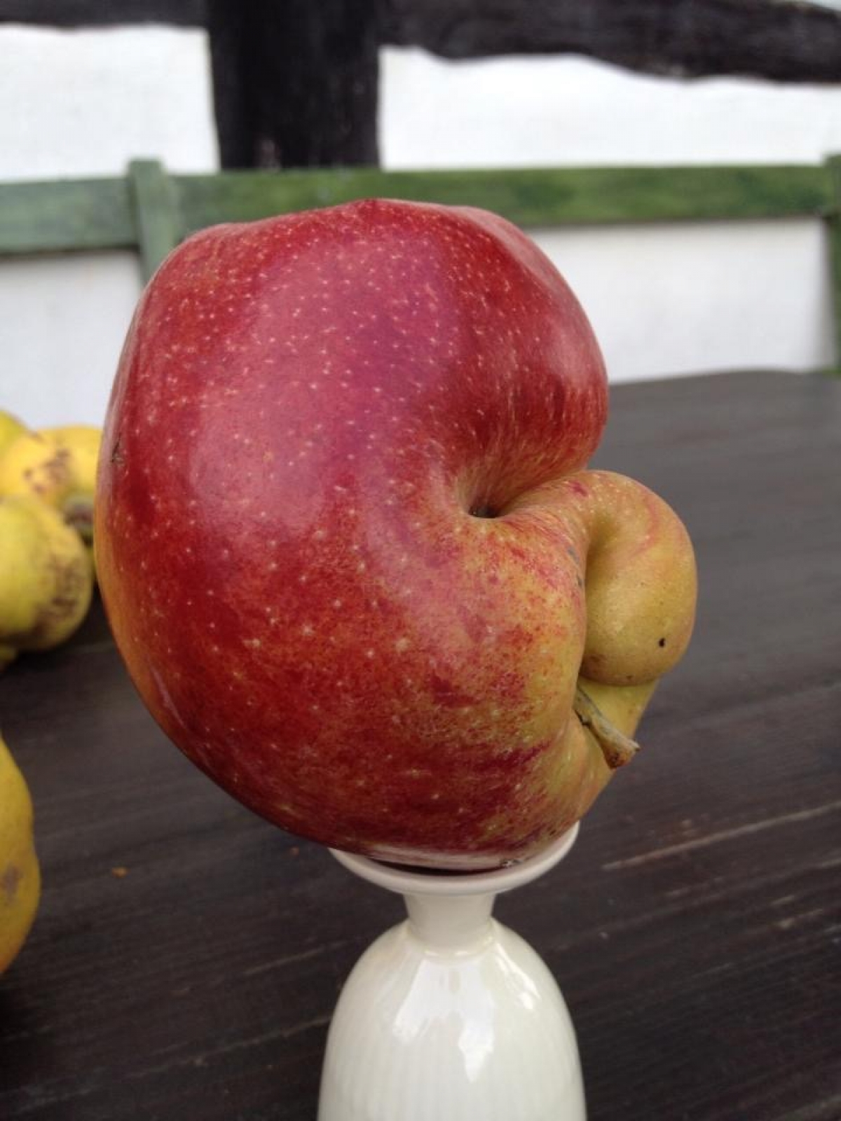 Deze appel van eigen oogst (Gronsvelder Klumpke) lijkt wat op een mannetje die een pijp rookt