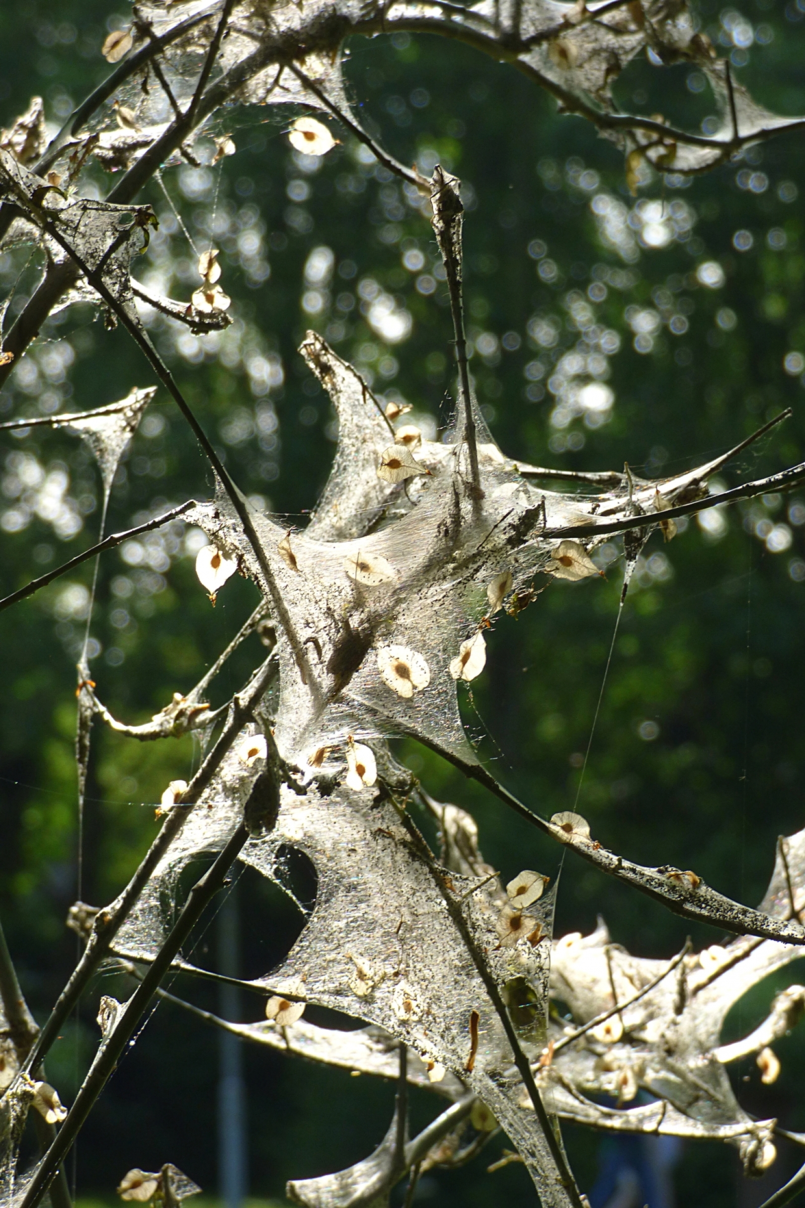 Een web van de spinselmot met ingewaaide zaadjes. Het ziet er feeëriek uit.