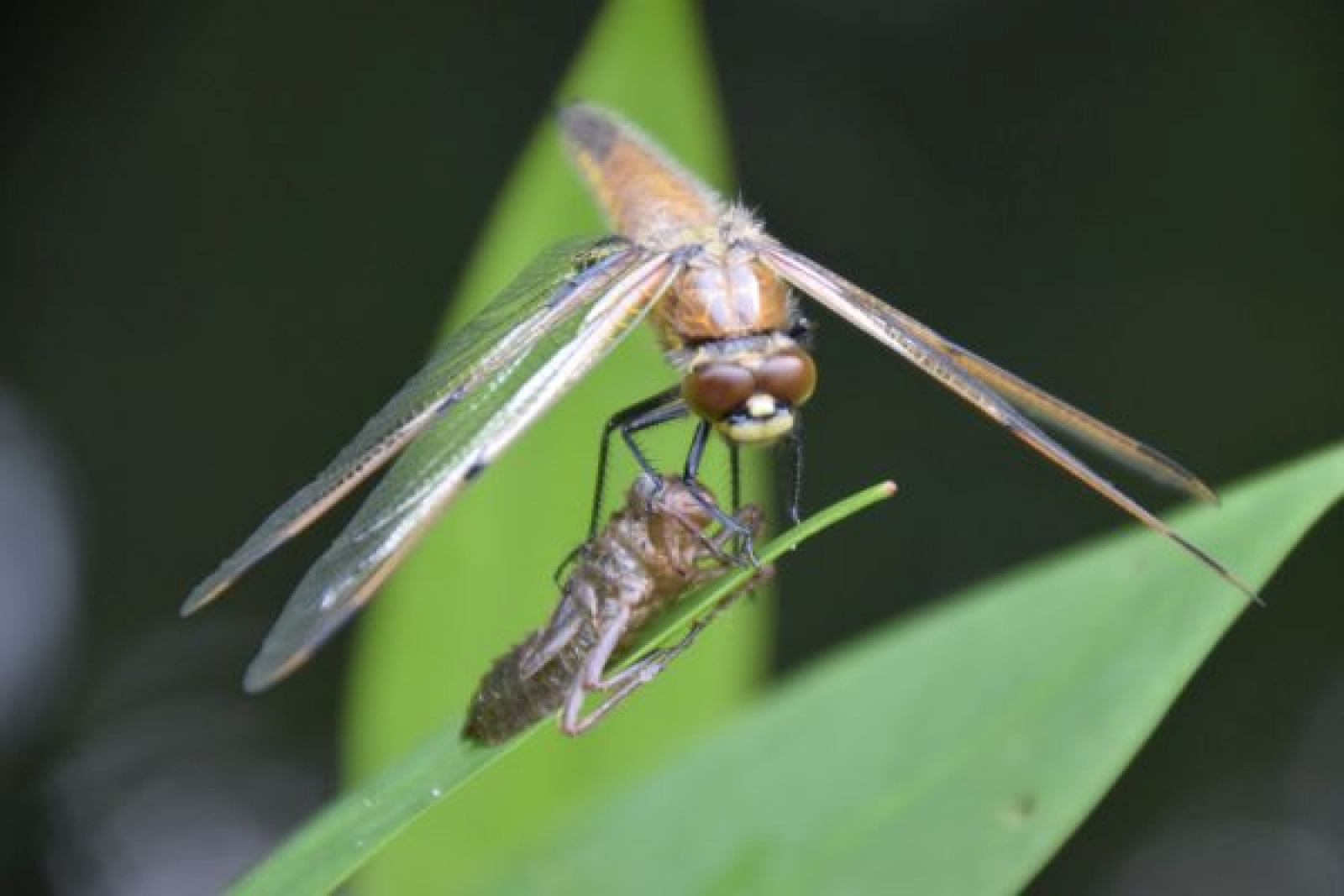 Zondagmorgen 28 mei in mijn vijver kwam ik deze Viervlek libel tegen op een waterplant. Zat ma het uitkomen te drogen voordat zij/hij een uurtje later zou wegvliegen.