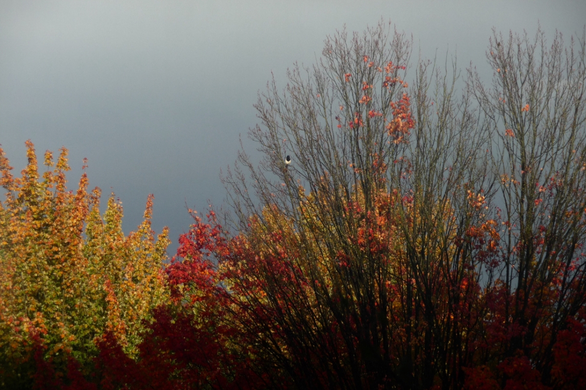 Dit zag ik door het raam, zittend op de bank. Donkere lucht vanmiddag, ekster hoog in de boom.