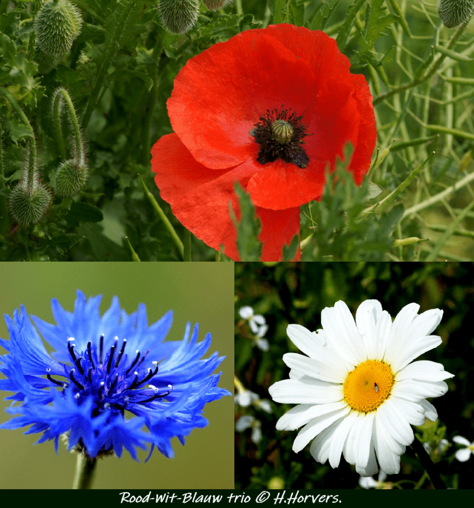 Rood-Wit-Blauw veldbloemen trio. Nostalgisch kleuren trio , als kind waren dit mijn favoriete bloemen