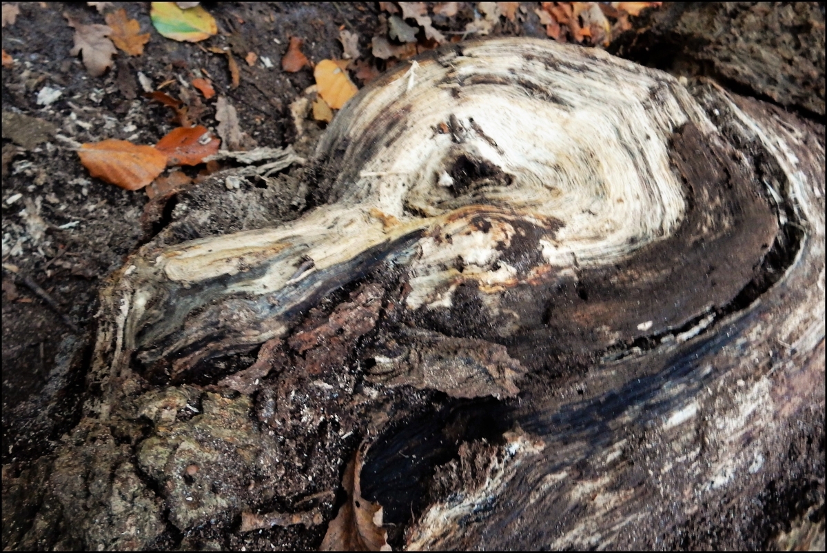 Na een boomstronk paar keer van verschillende kanten te hebben bekeken haalde ik hier een hondenkop met een kluif in zijn bek uit.