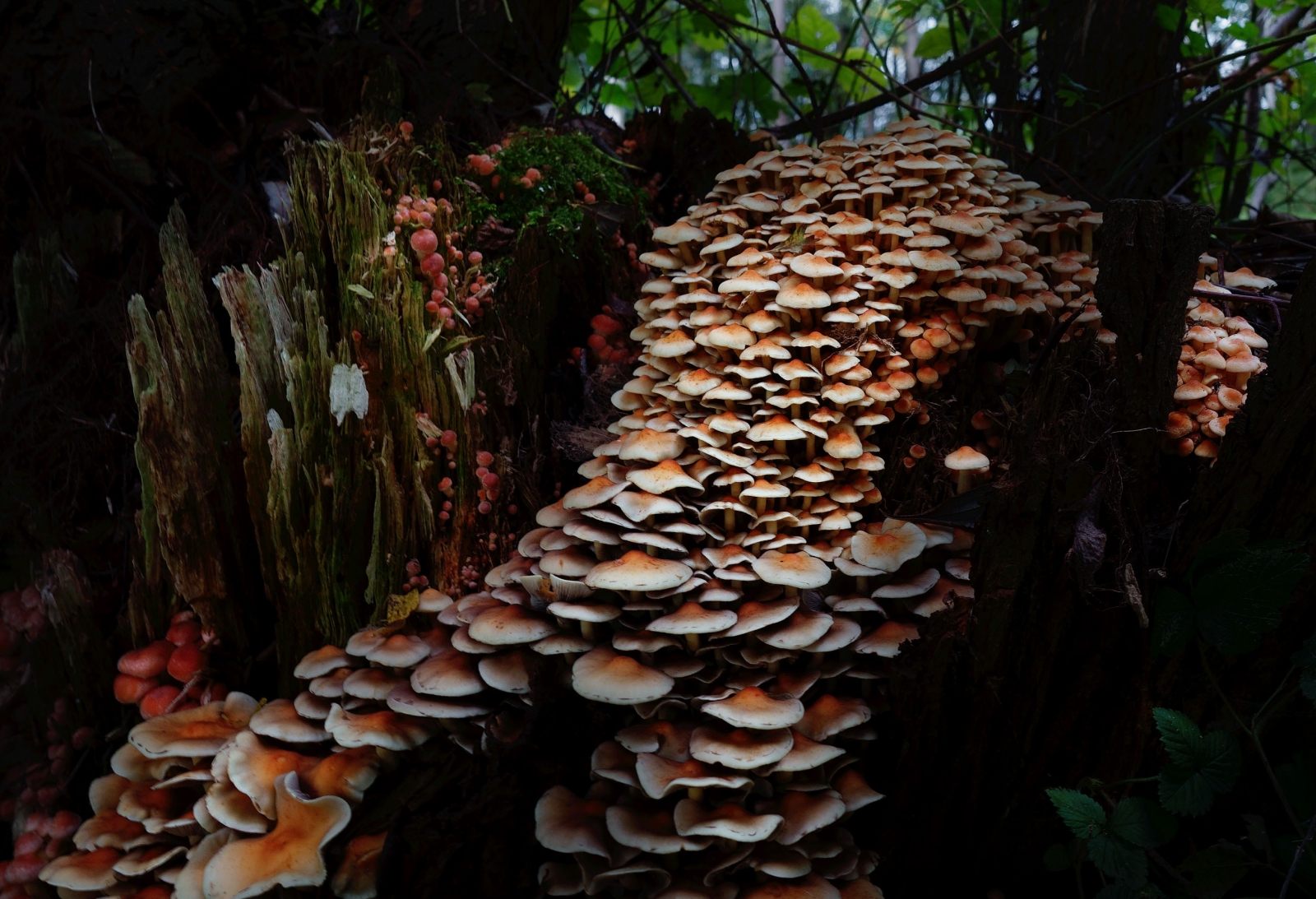 Deze foto is genomen op 15 oktober in het Westerpark in Zoetermeer. Ik ben meer fotograaf dan paddenstoelenkenner. Zo'n verzameling paddestoelen had ik nog nooit gezien. Door het licht en de kleuren, in samenhang met de mysterieuze, grotachtige restanten van de rottende boom kreeg ik de associatie met een grot of ruïne in een sprookjesbos.