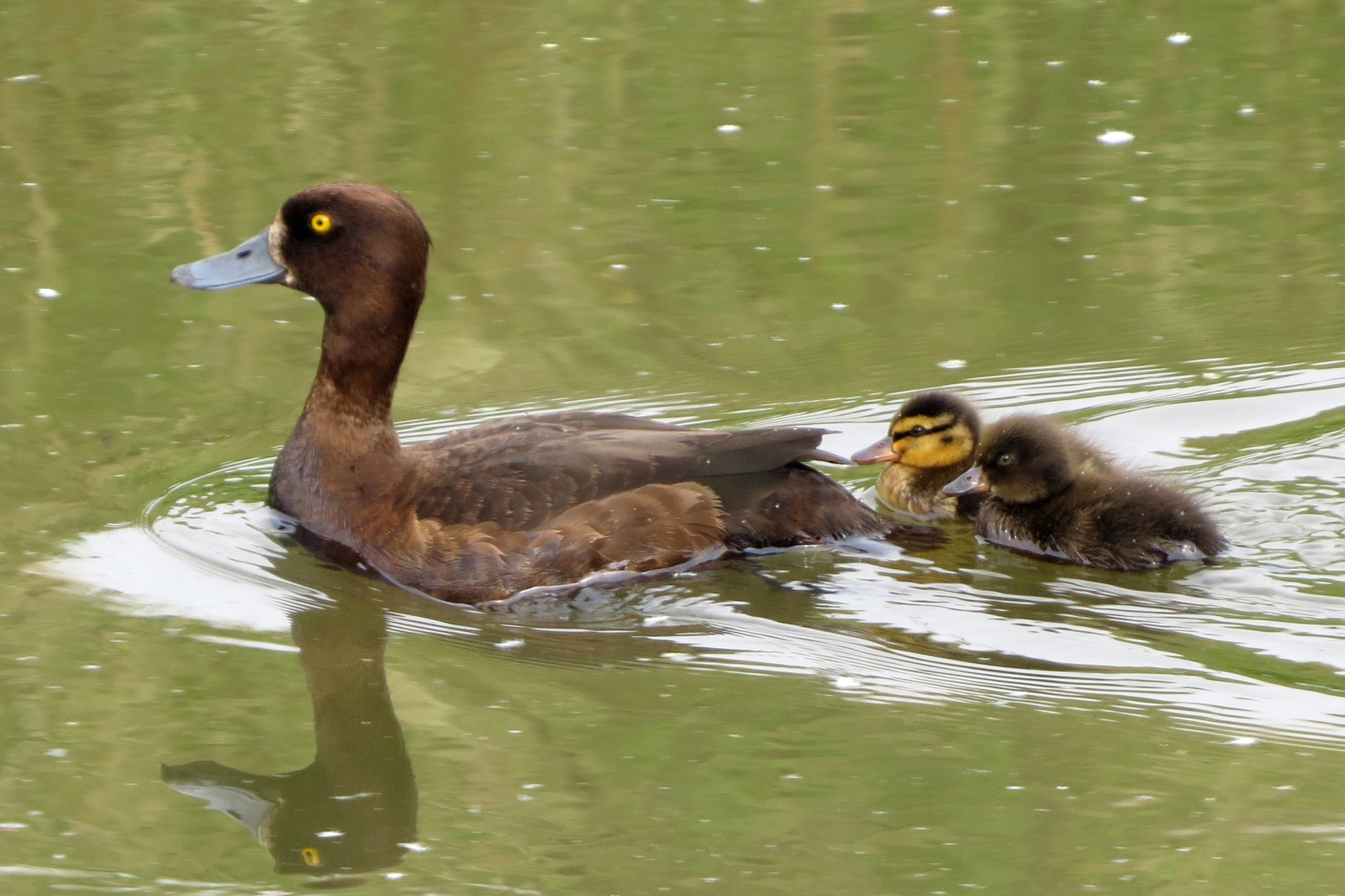 Kuifeend met adoptie wilde eendkuiken