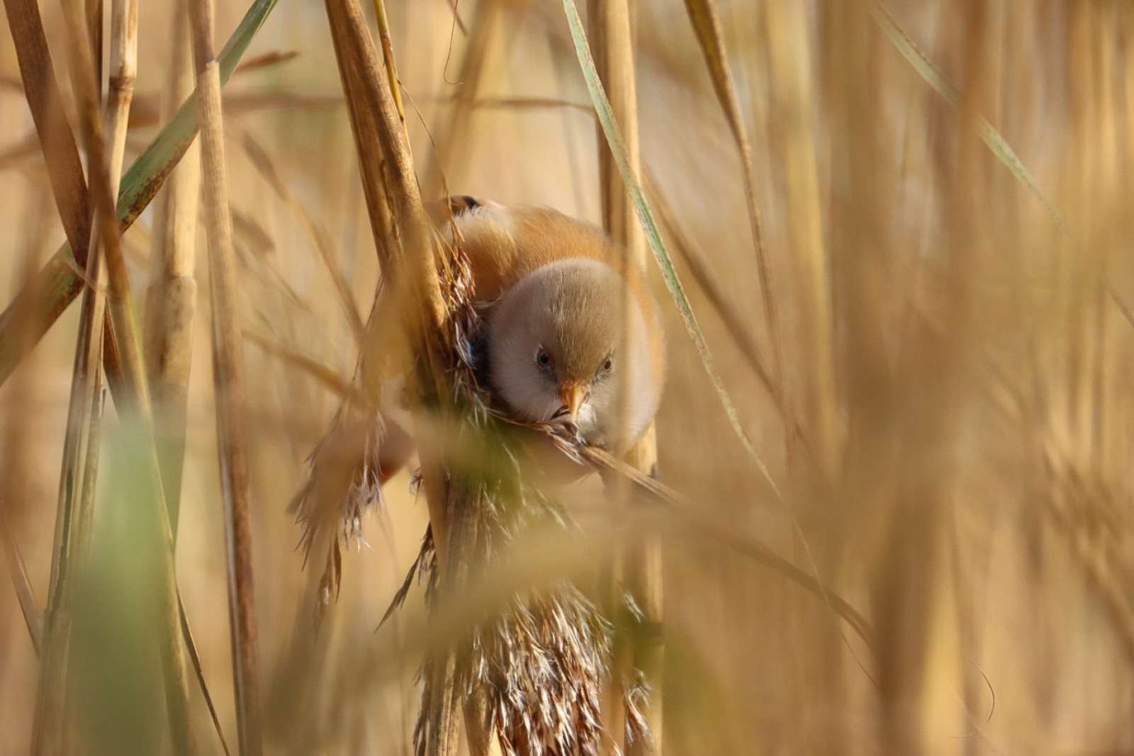Tussen het riet waren vlakbij enkele baardmannetjes te horen. Af en toe kon ik tussen de stengels een glimp van ze opvangen, zoals van het vrouwtje op de foto, dat net een zaadje uit een halm pikte.