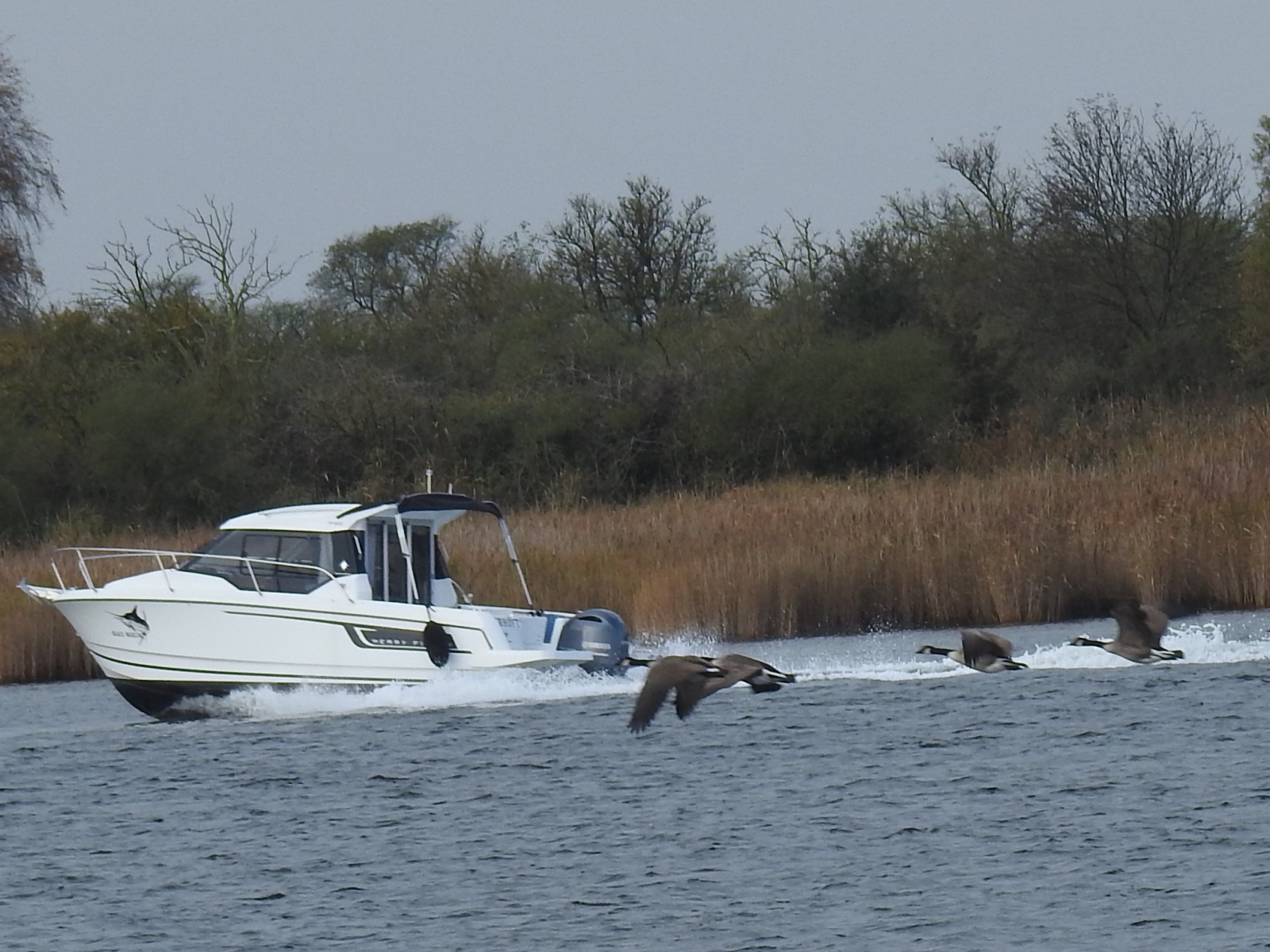 Canadese ganzen vliegen langs een snelvarende boot voor de kust bij Rügen (BRD) De Canadese gans lijkt op de brandgans maar is groter .