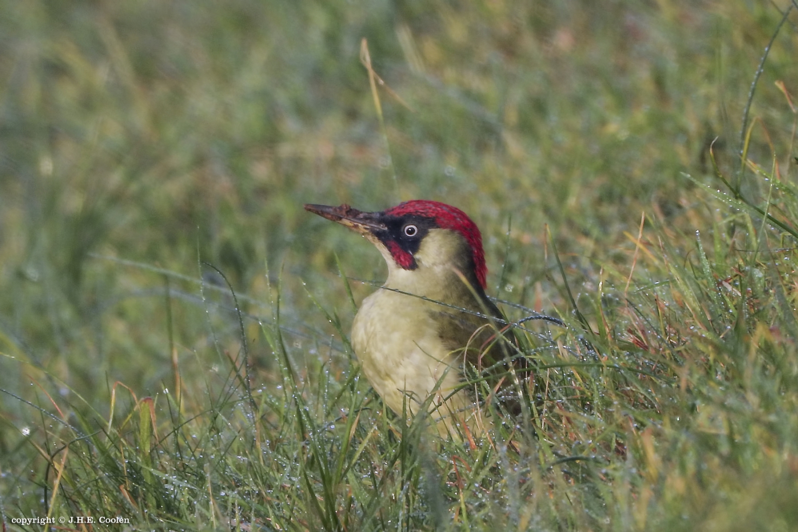 Schitterende foto, van deze prachtige Groene Specht , met druppeltjes , ook nog in het gras. Super.