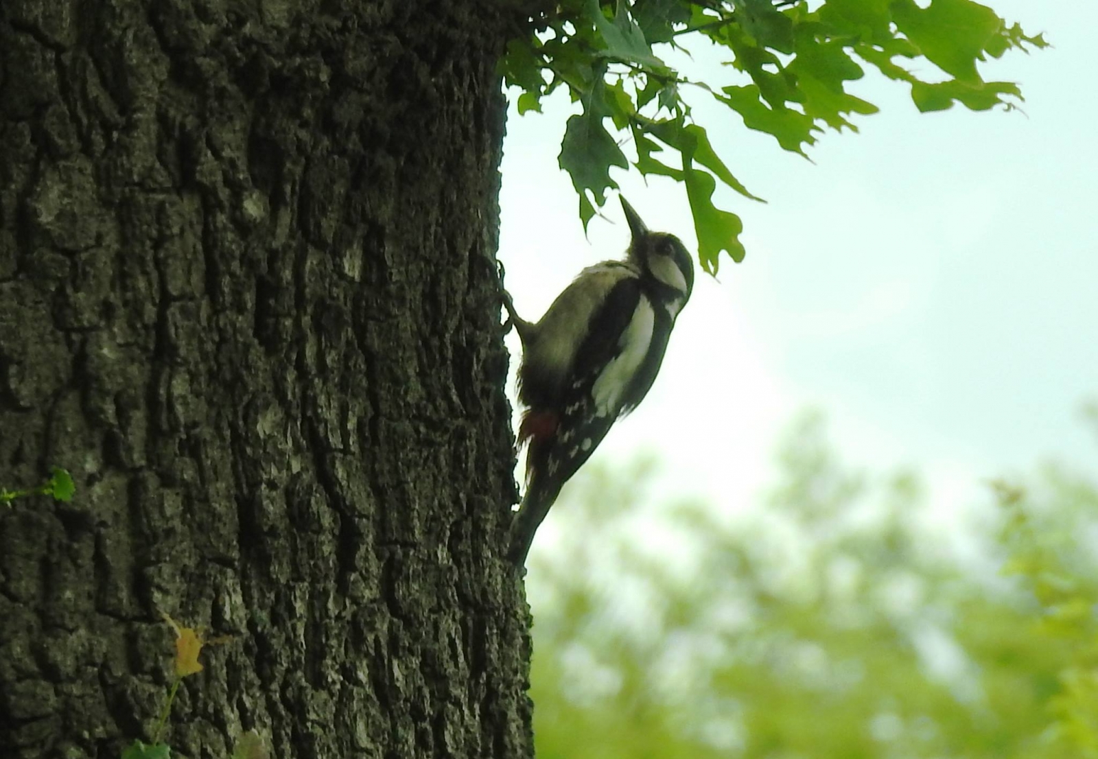Twee spechten speelden verstoppertje achter de dikke stam. Bij toerbeurt kwam er één in beeld.