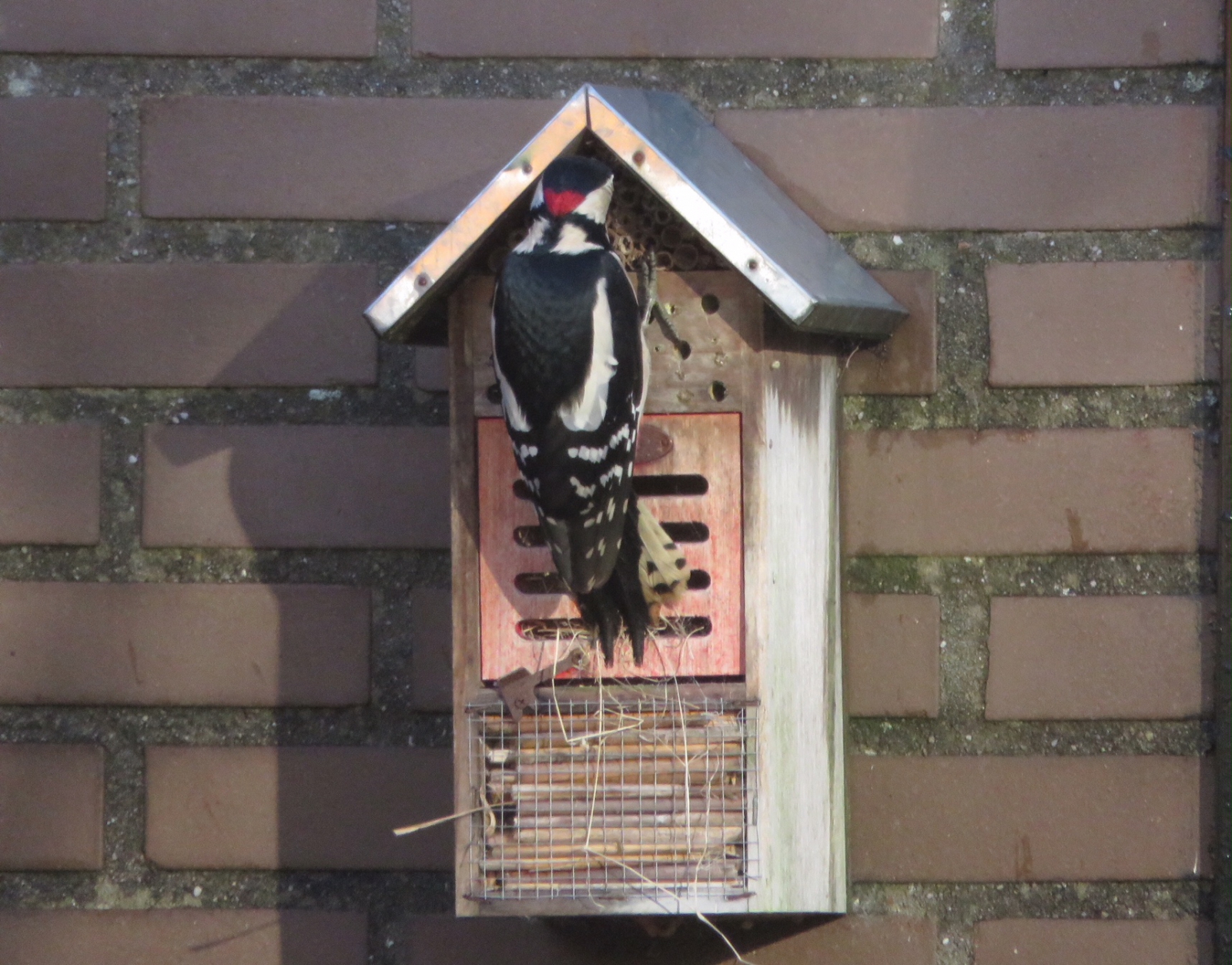 Vanochtend (19 nov 2017) was deze slimme bonte specht op zoek naar voedsel in het insektenhotel in onze tuin in De Bilt. Foto van dochter Corinne.
