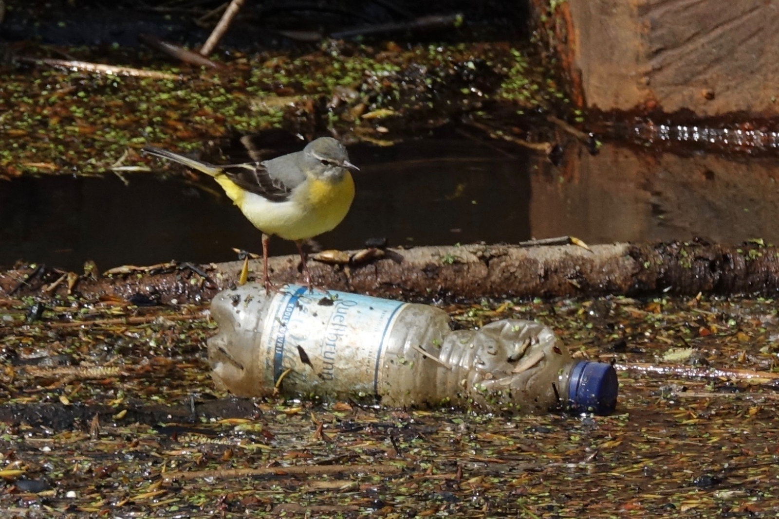 Dit broedende vrouwtje Grote Gele Kwikstaart zoekt (tussen de rommel in de Dommel) naar insecten voor haar jongen.