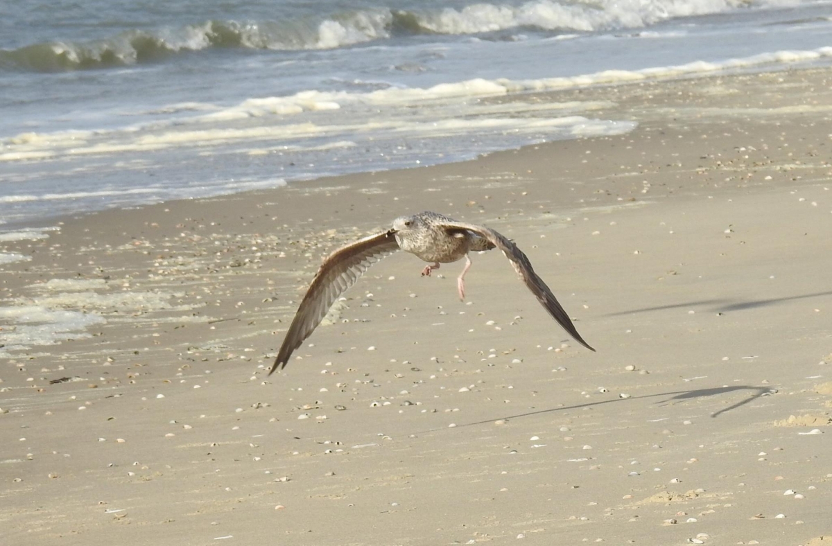 Jonge mantelmeeuw landt op het strand