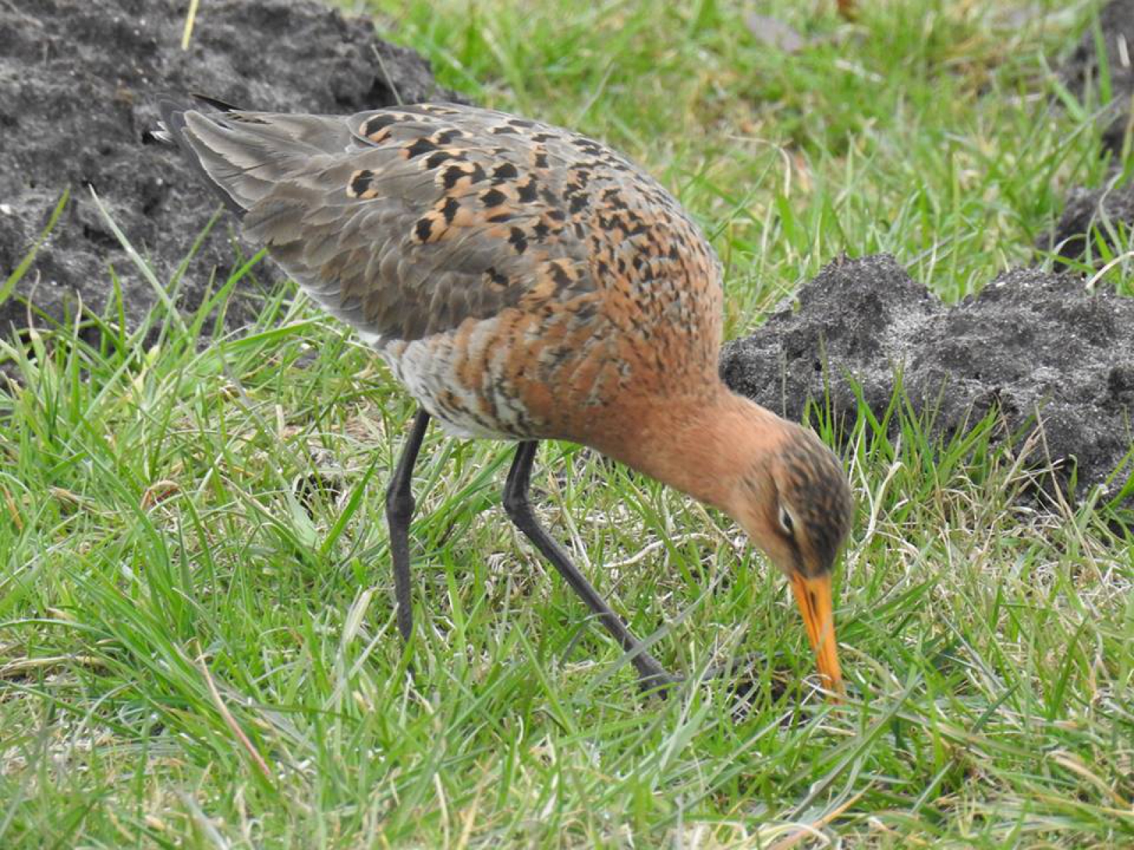 Deze grutto wroet druk met zijn snavel in de bodem. Een regenworm komt hierdoor omhoog, maar deze wordt weggepikt door een kievit.