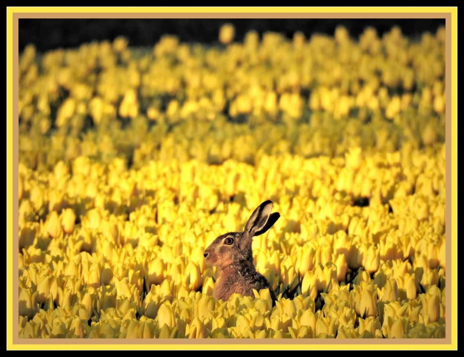 Vandaag even gekeken of ineen tapuit of kwikstaart kon vastleggen tussen de tulpen, geen vogel te zien maar dit maakte het weer goed een haas die even met het kopje boven de typen keek of de boel veilig was.
