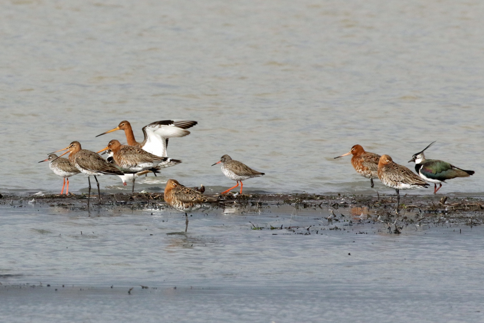 Twee kieviten, twee tureluurs en een aantal grutto's.